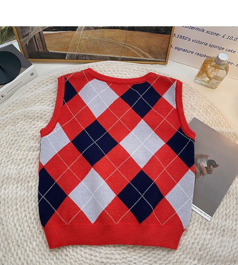 草引コントラストカラーアーガイルショートニットベスト女性 2022 秋のチョッキ因果 O ネックノースリーブセータートップス オータム 秋物 Oネック kor90823158223