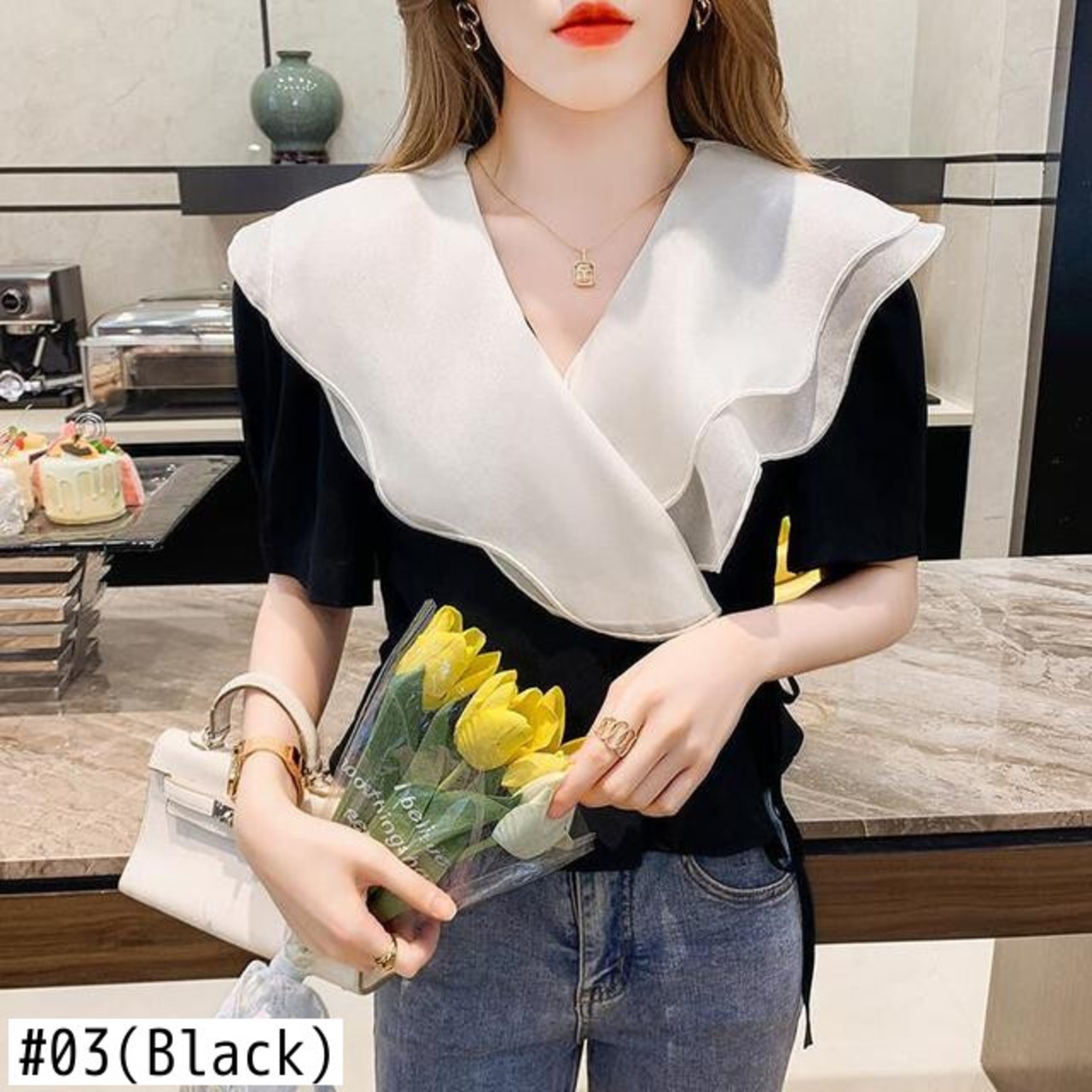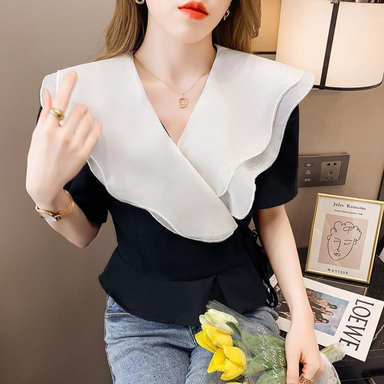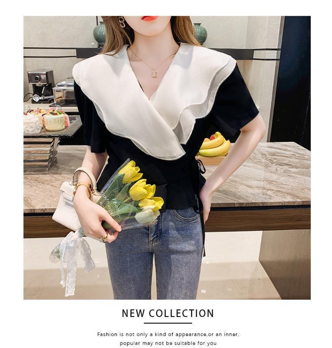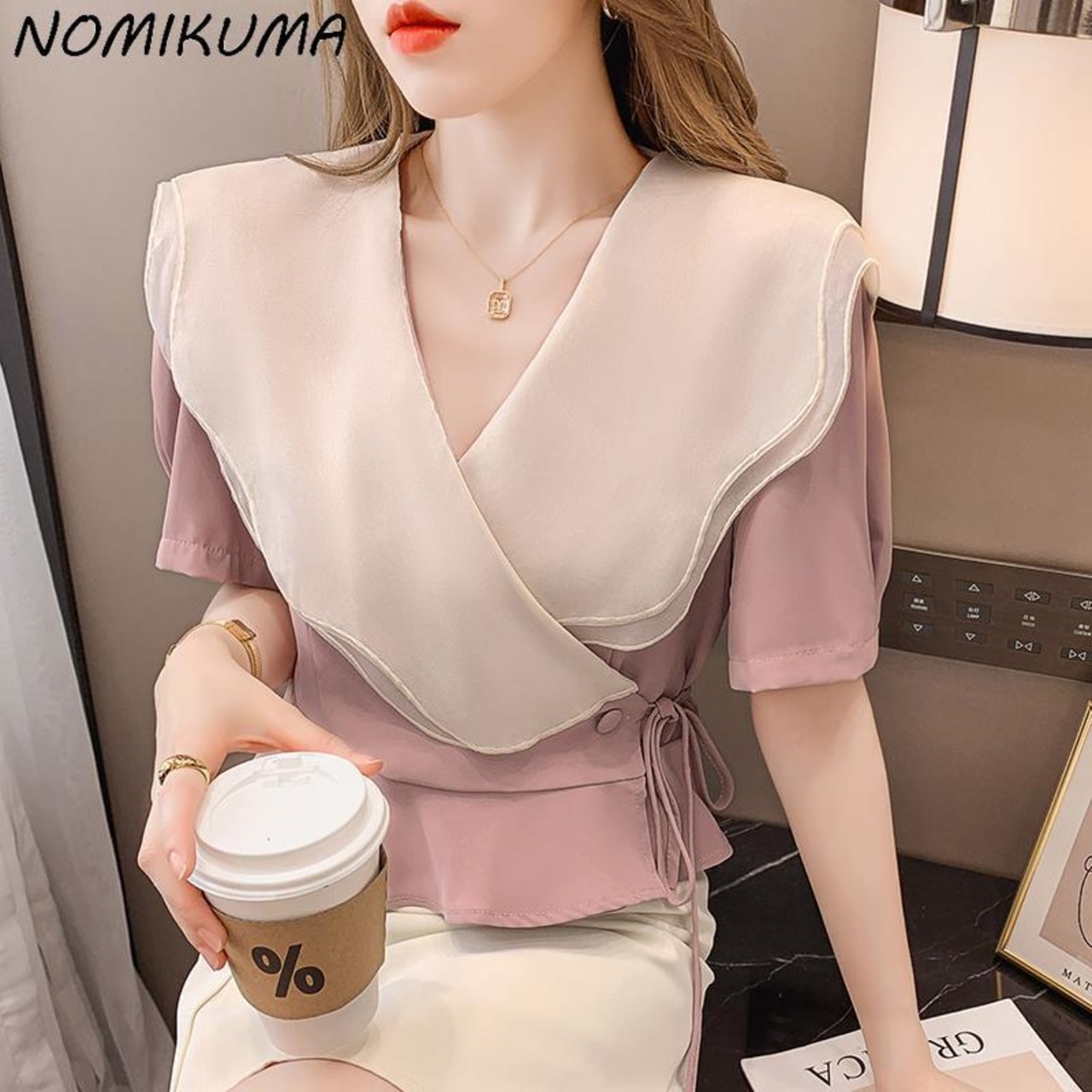 ノミクマ半袖シフォンブラウス女性ヒットカラーフリル V ネックシャツ 2022 夏レースアップスリムウエストトップ ショート ハーフスリーブ サマー 夏物 Vネック kor57154986534
