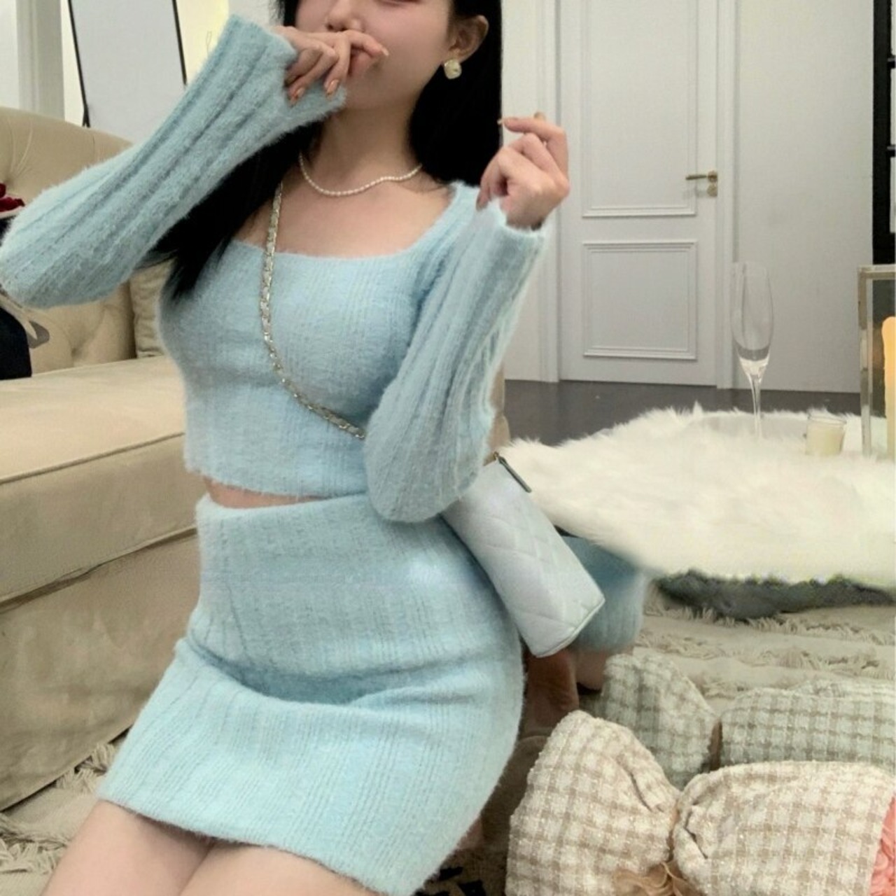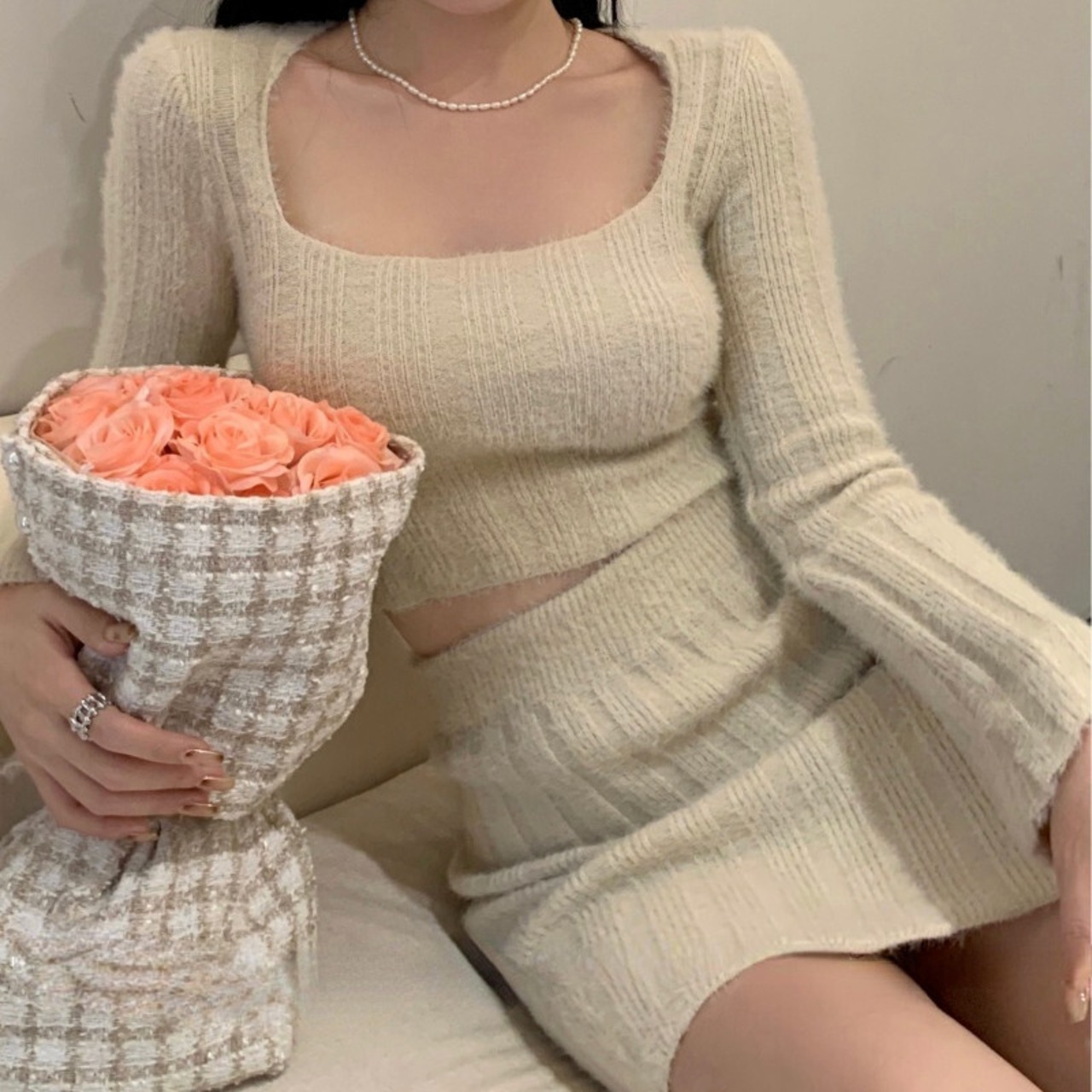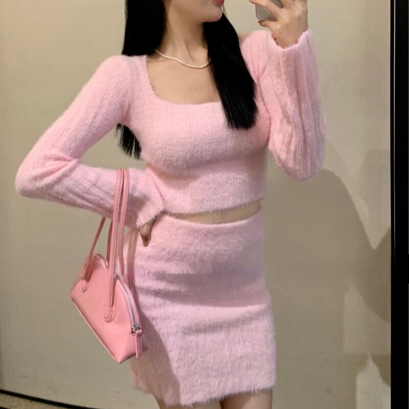 Nomikuma 女性 2022 セーターセットショートソリッドスクエアカラーニットウェアトップス + ウエストミニスカートニット衣装 ソリッドカラー スクウェア kor53101755167