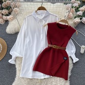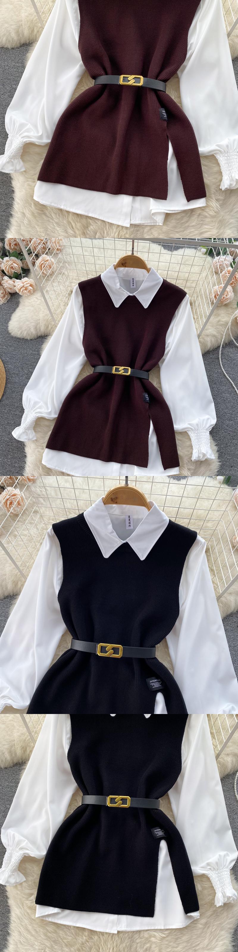 Nomikuma 二枚女性トップセット長袖ターンダウン襟ブラウスシャツ + ベルトスリムウエストニットベスト 2022 秋 ロング オータム 秋物 ハーネス kor11281282459