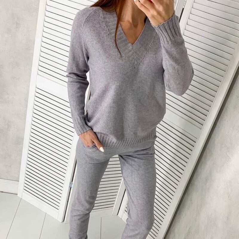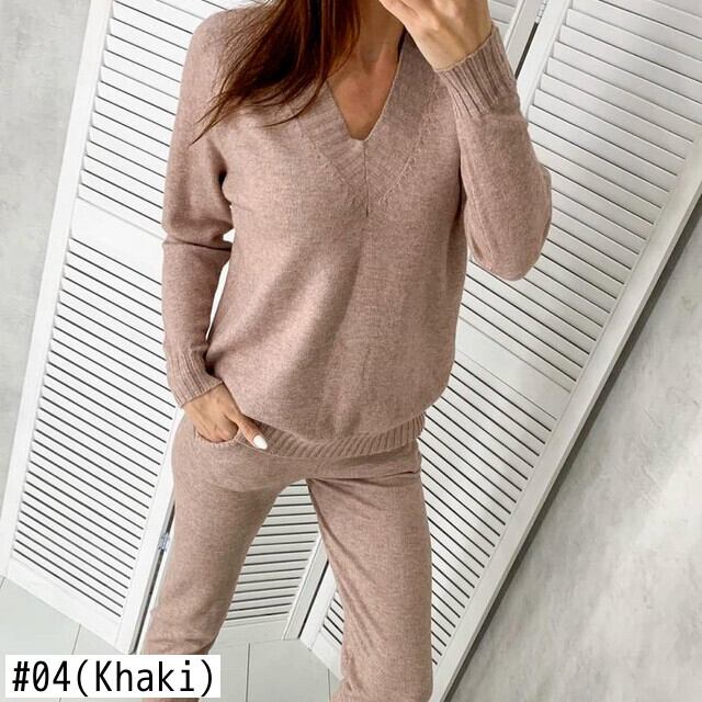 ノミクマ因果汗ツーピース女性スーツ長袖 V ネックプルオーバーセーター + ウエストニットパンツセット 6Z946 ロング Vネック kor33198331448