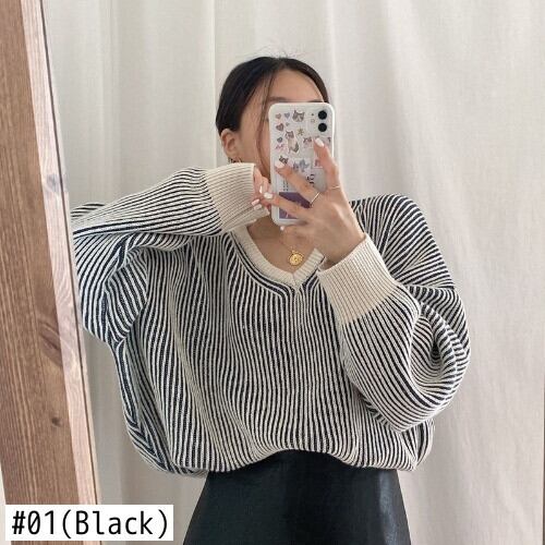 ノミクマ因果バットウィングスリーブVネックストライプヒットカラーニットプルオーバーセーター2022秋冬ニットプルオーバー オータム 秋物 ウィンター 冬物 kor12449393184
