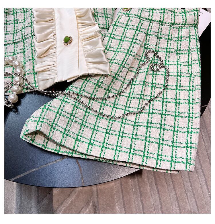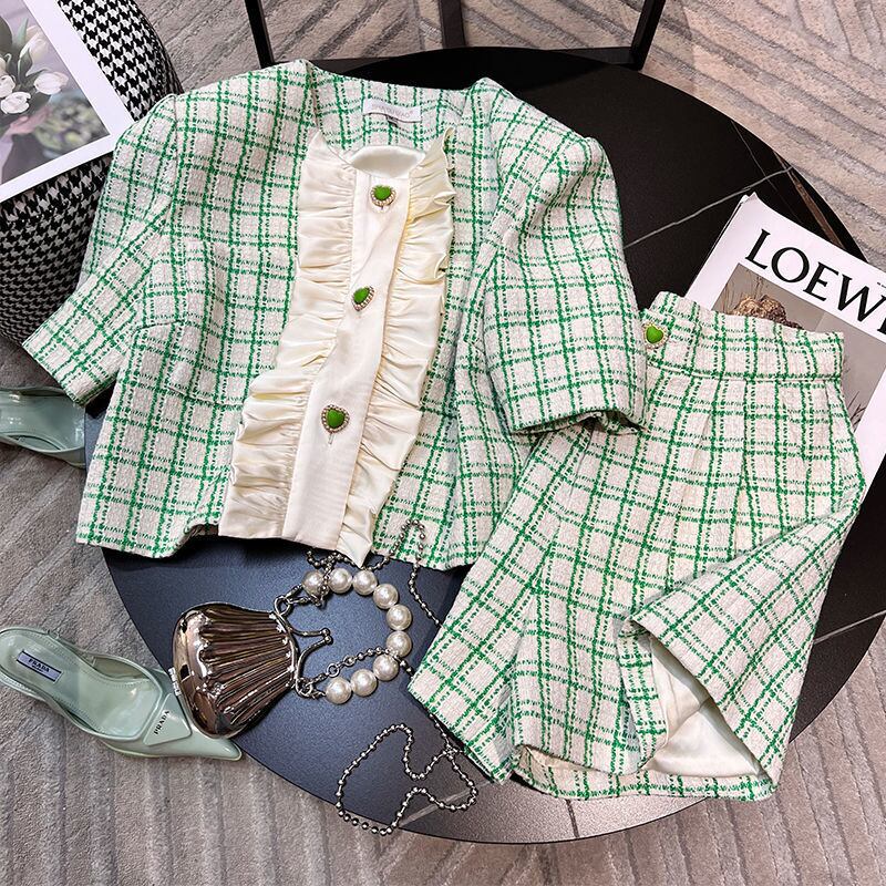 Nomikuma チェック柄セット女性 2022 夏ツーピースシックなフリル半袖 O ネックトップ + ウエストショーツスーツ ショート ハーフスリーブ サマー 夏物 ブルマー Oネック kor55698546512