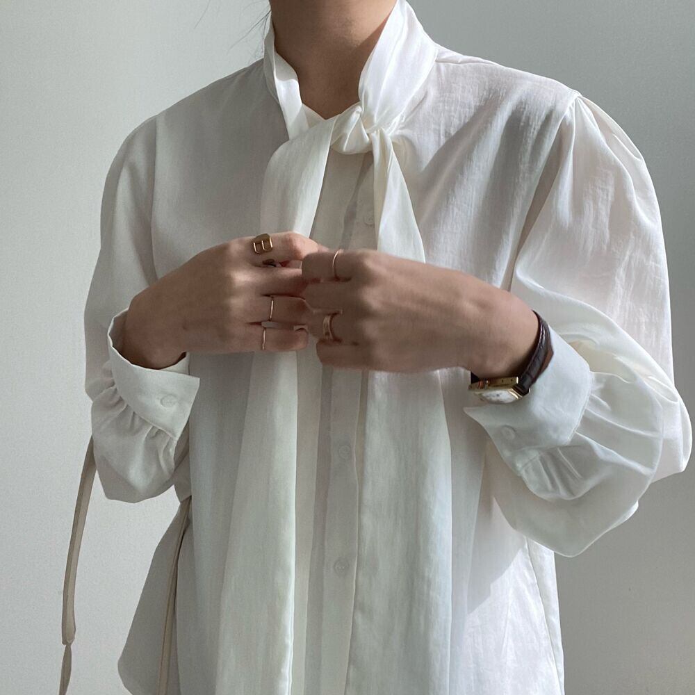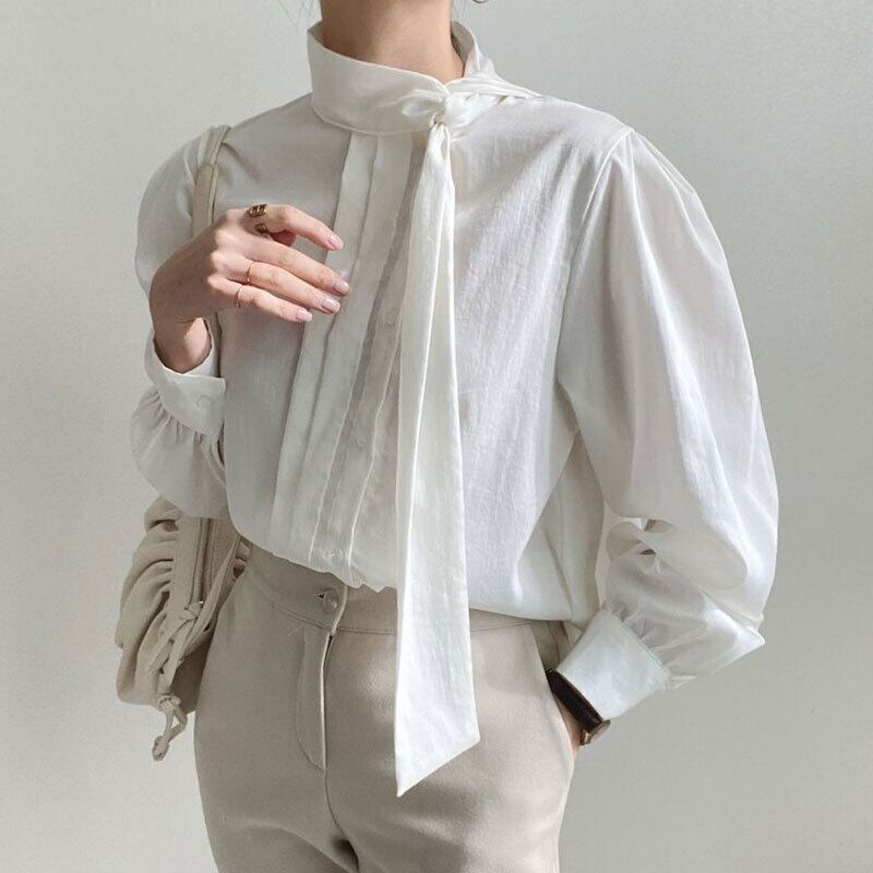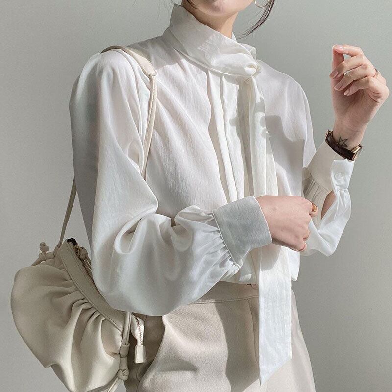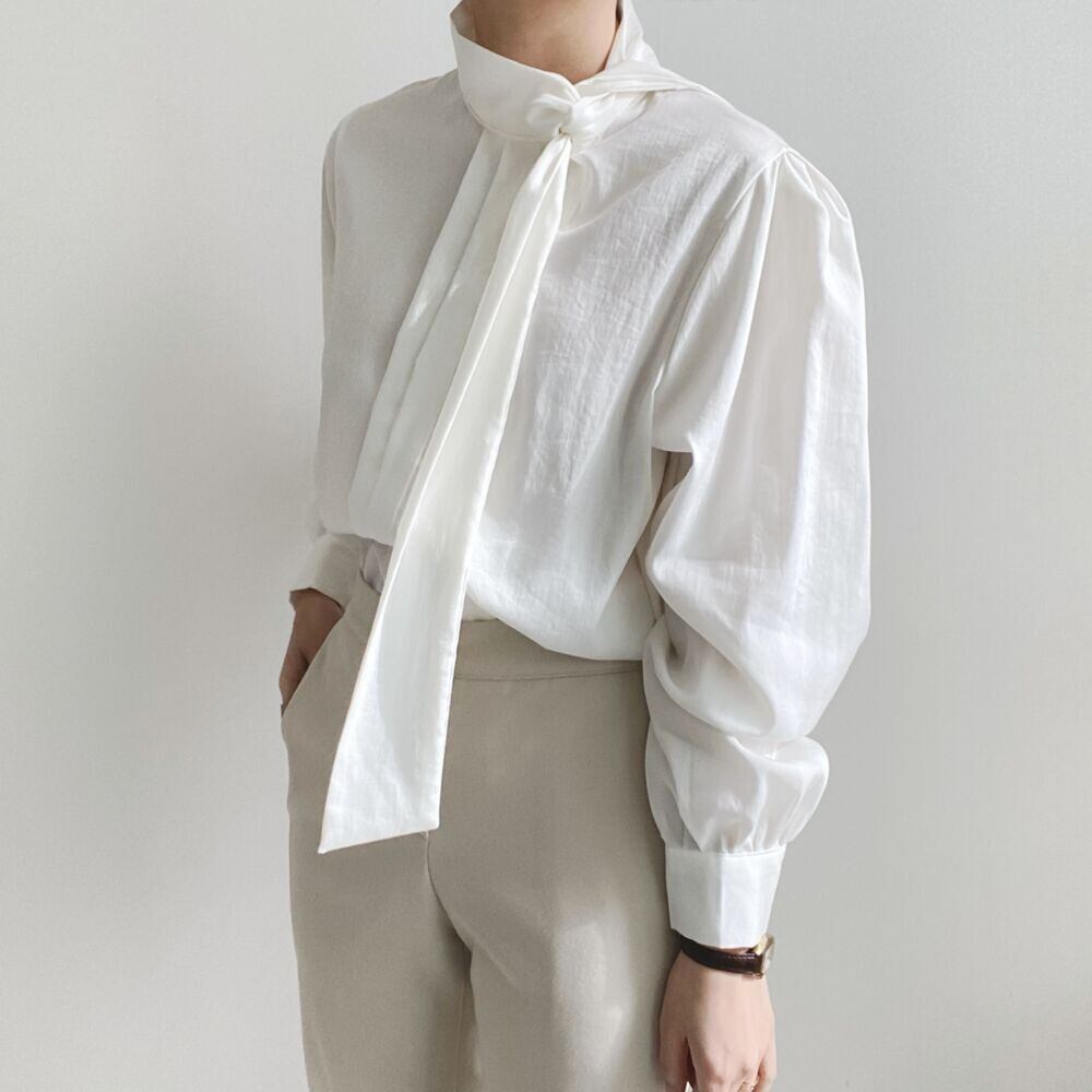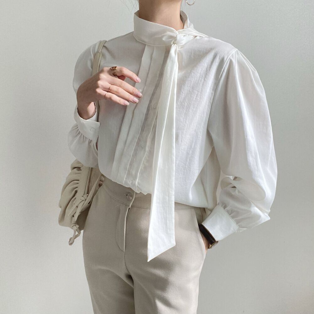 ノミクマ スタンドネック リボン レディース トップス パフ ロング ルシーブ 無地 シャツ 2022年 秋 ブラウス オータム 秋物 ソリッドカラー kor17206916762