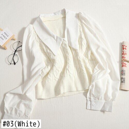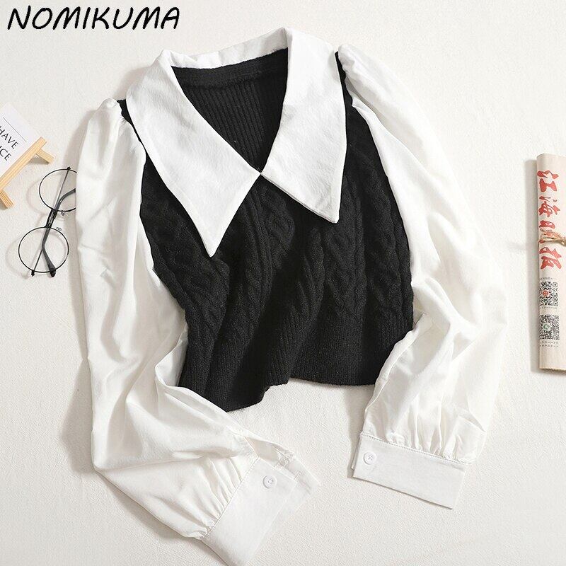 Nomikuma 2022 秋ニットパッチワークレディーストップス甘いピーターパン襟パフスリーブブラウスシックなショートシャツ 大人ガーリー スウィート キュート カジュアル オータム 秋物 kor94379024013