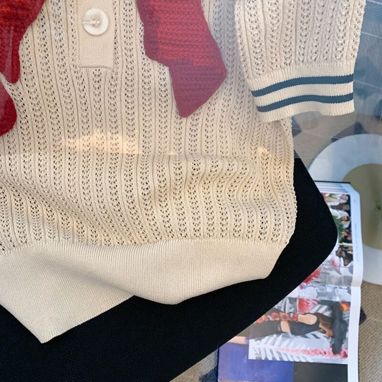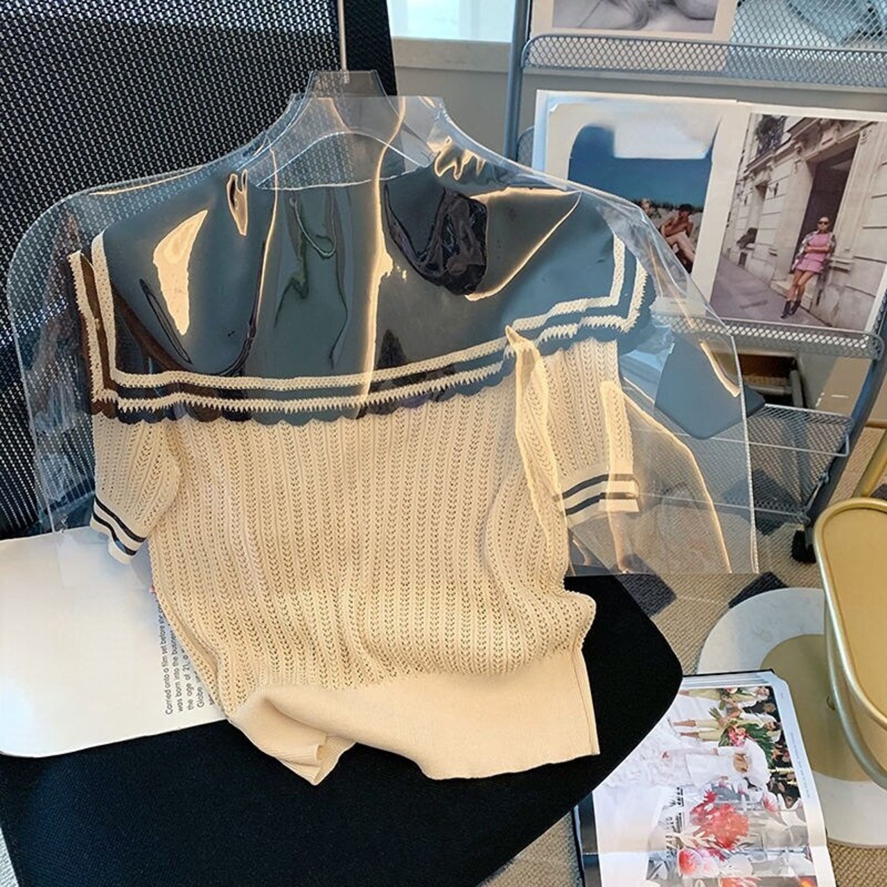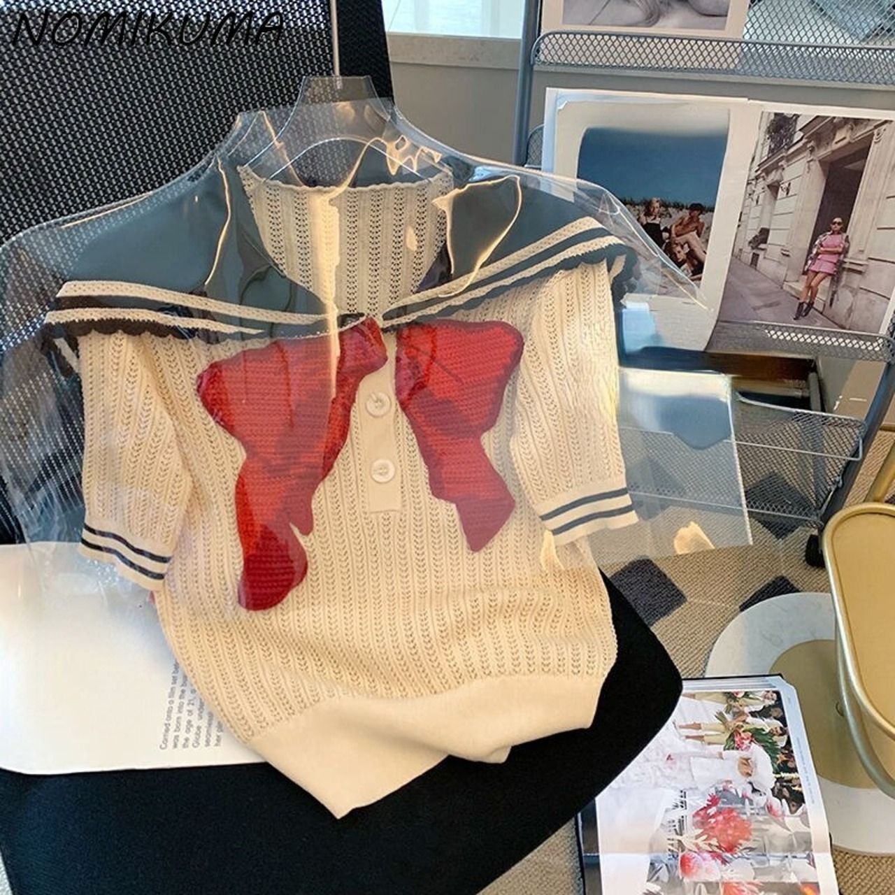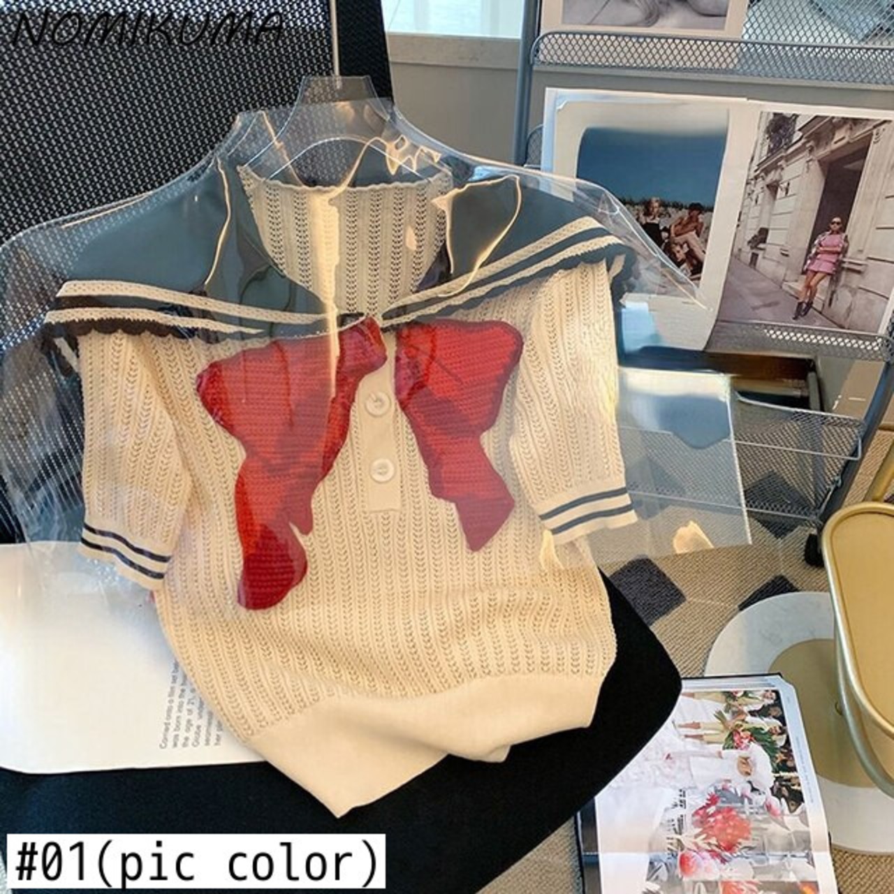 Nomikuma 甘いちょう結びセーラー襟ニット因果パフスリーブ女性セーター 2022 夏中空アウトニットプルオーバー リボン 大人ガーリー スウィート キュート カジュアル サマー 夏物 kor50751036111