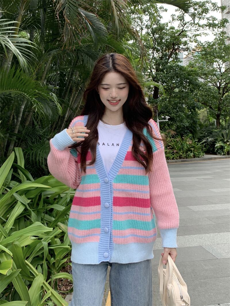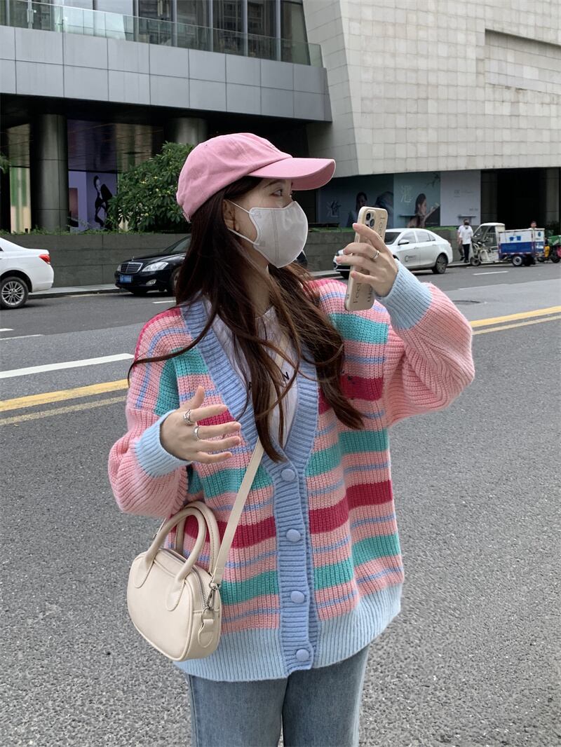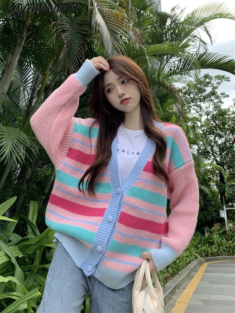 Nomikuma ヒットカラーストライプ刺繍カーディガンセーター女性 V ネックシングルブレスト甘い秋 2022 ニットコート 大人ガーリー スウィート キュート カジュアル オータム 秋物 Vネック kor39600797097