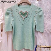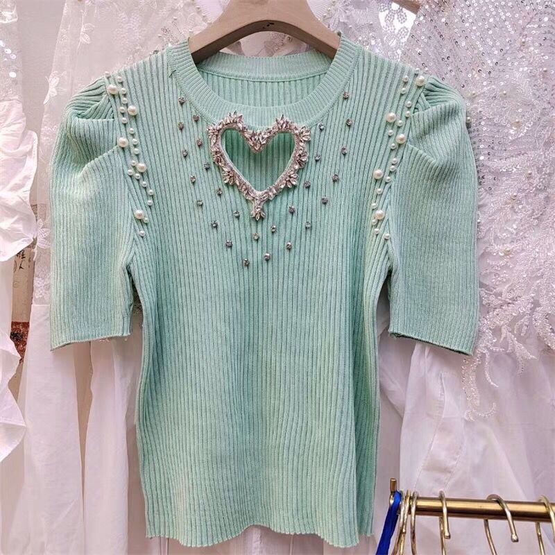 ノミクマシックダイヤモンドラブハート中空アウトニットビーズパフスリーブスリムニットセーター2022夏甘いプルオーバー 大人ガーリー スウィート キュート カジュアル サマー 夏物 kor8332620337