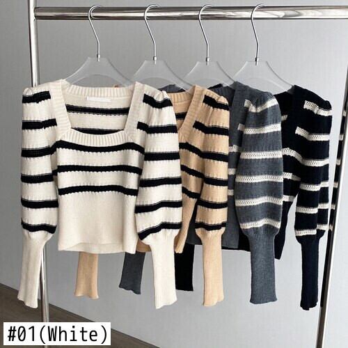 Nomikuma ストライプニットセーター女性パフスリーブスクエアカラープルオーバーニット 2021 秋冬トップス 6V420 オータム 秋物 ウィンター 冬物 スクウェア kor57193666072