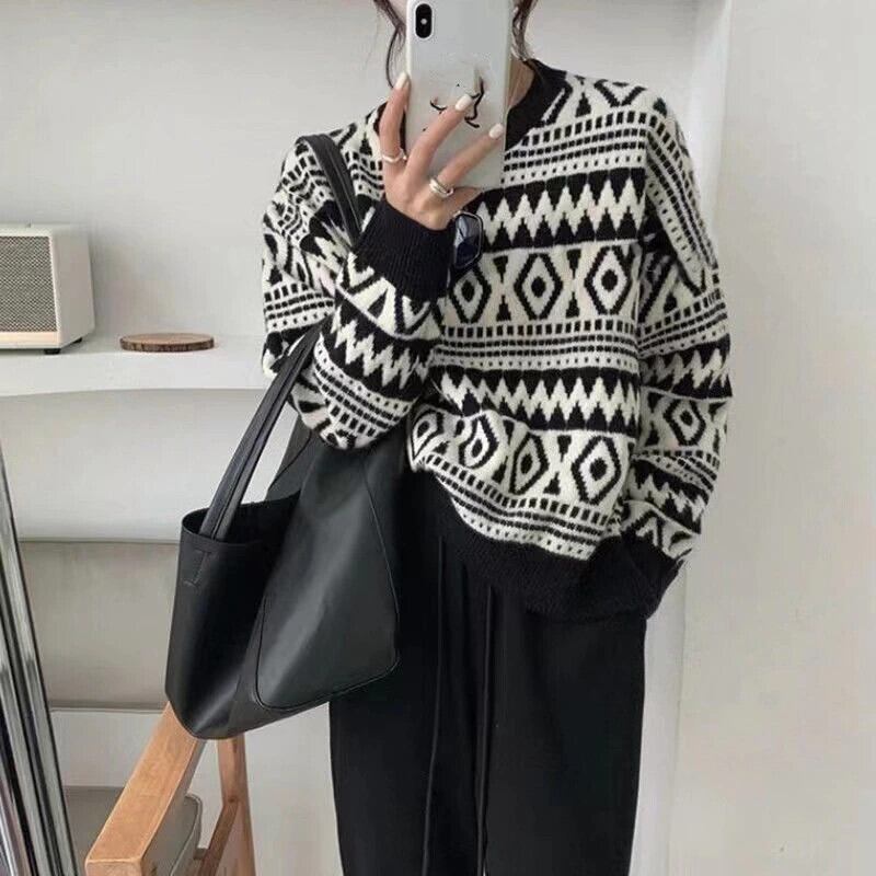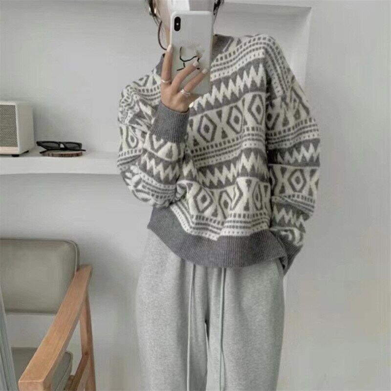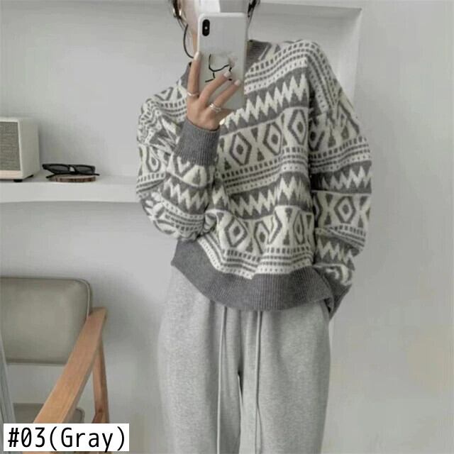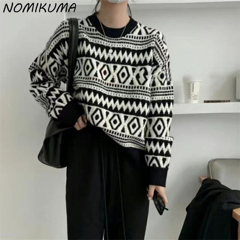 Nomikuma プル秋冬アーガイル女性セーター 2022 因果長袖 O ネックプルオーバーニットプルトップス ロング オータム 秋物 ウィンター 冬物 Oネック kor83288161010