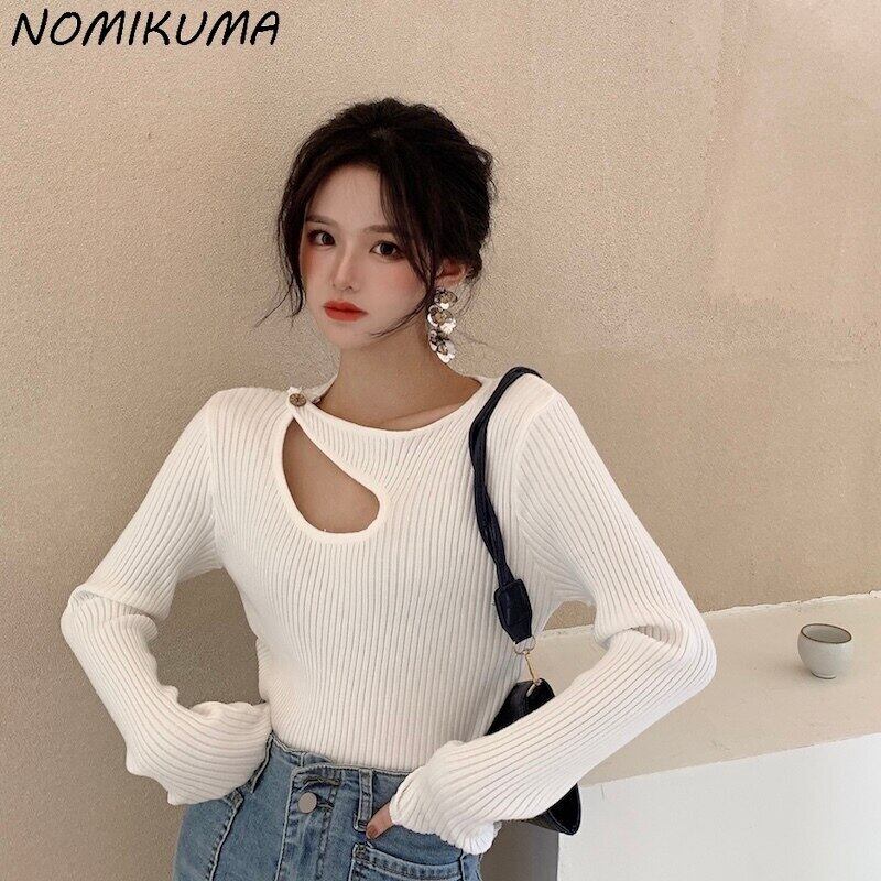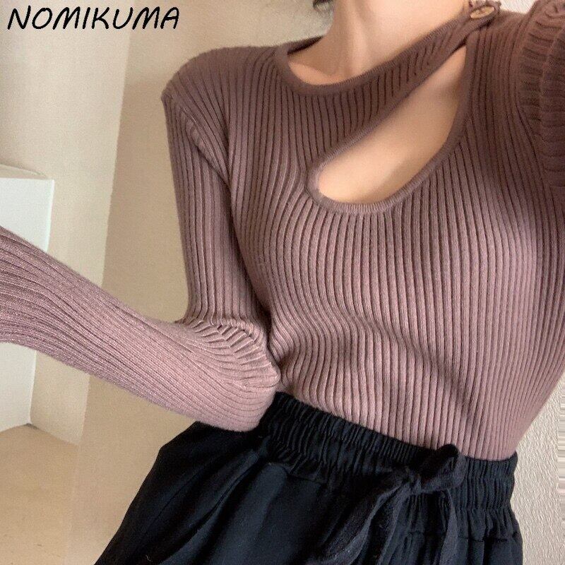 Nomikuma セクシーな中空アウト O ネックスリムベーシックニットトップス 2022 春の女性長袖スタイルプルオーバーセーター ロング スプリング 春物 Oネック kor25772561955