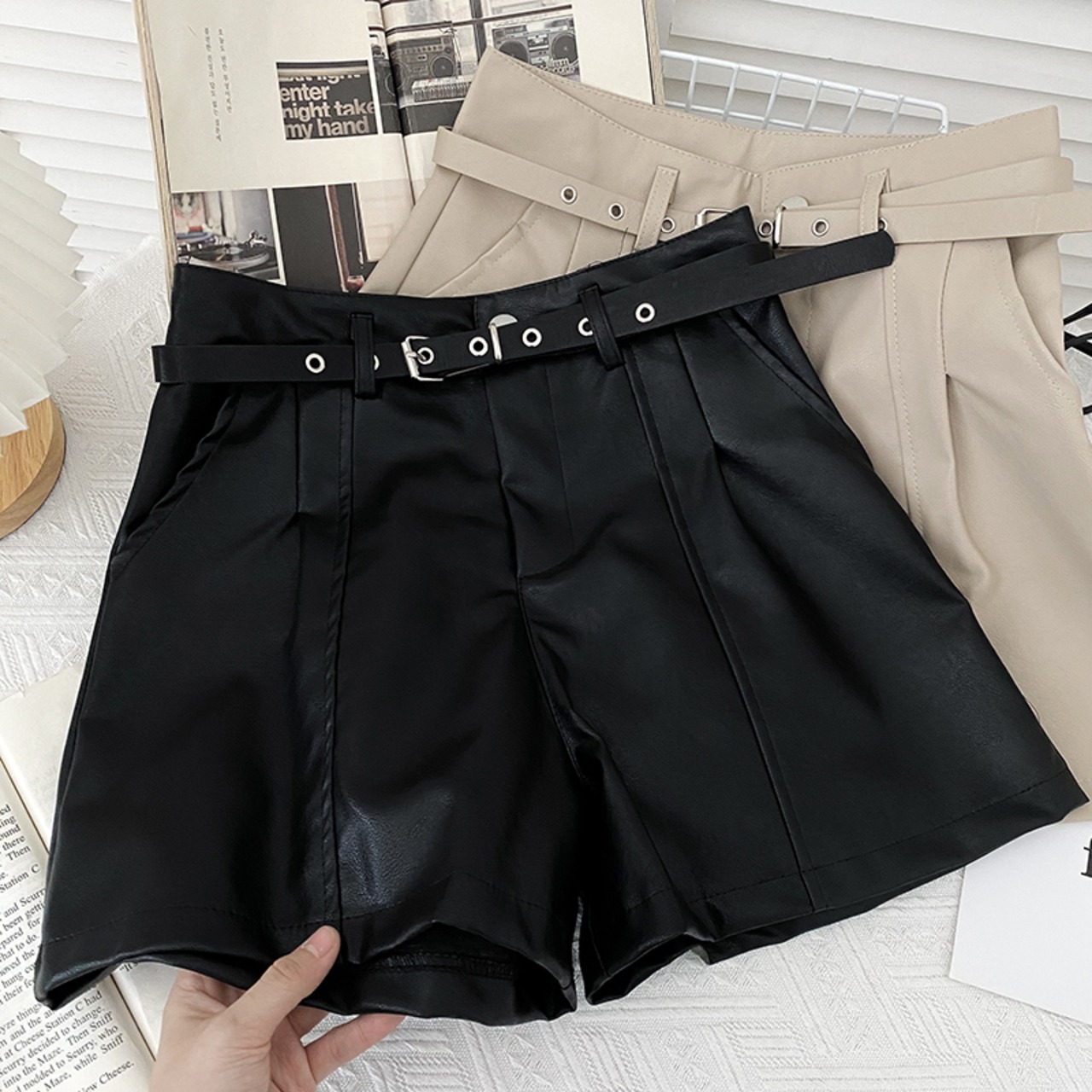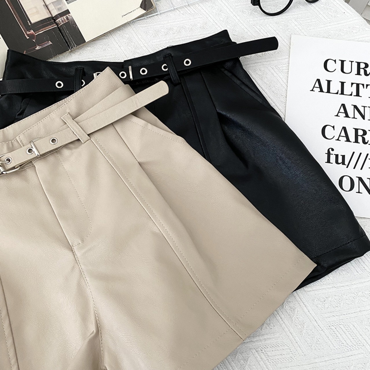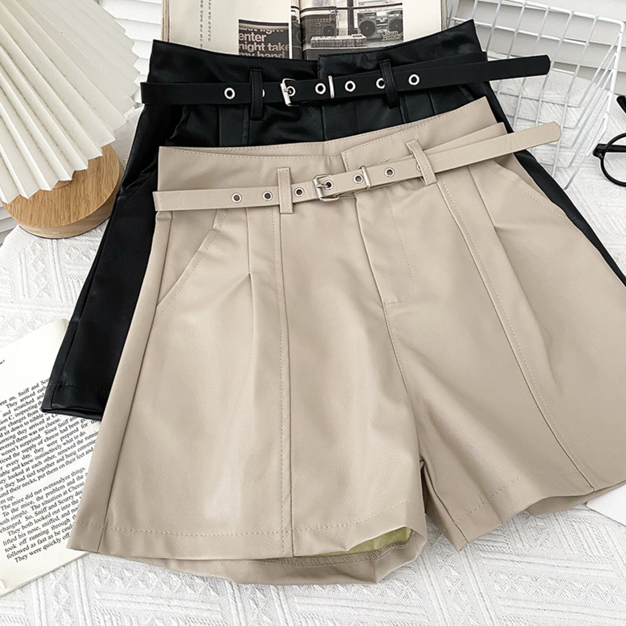 ノミクマ PUレザー ウエストワイドレッグショーツ ベルト付き 2022秋冬 ボトムス 無地 レディース ショートパンツ オータム 秋物 ウィンター 冬物 ハーネス ブルマー ワイドパンツ ソリッドカラー kor41466470618