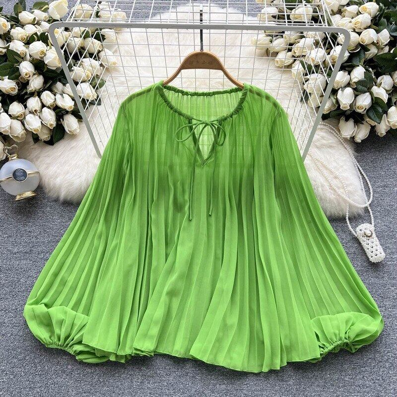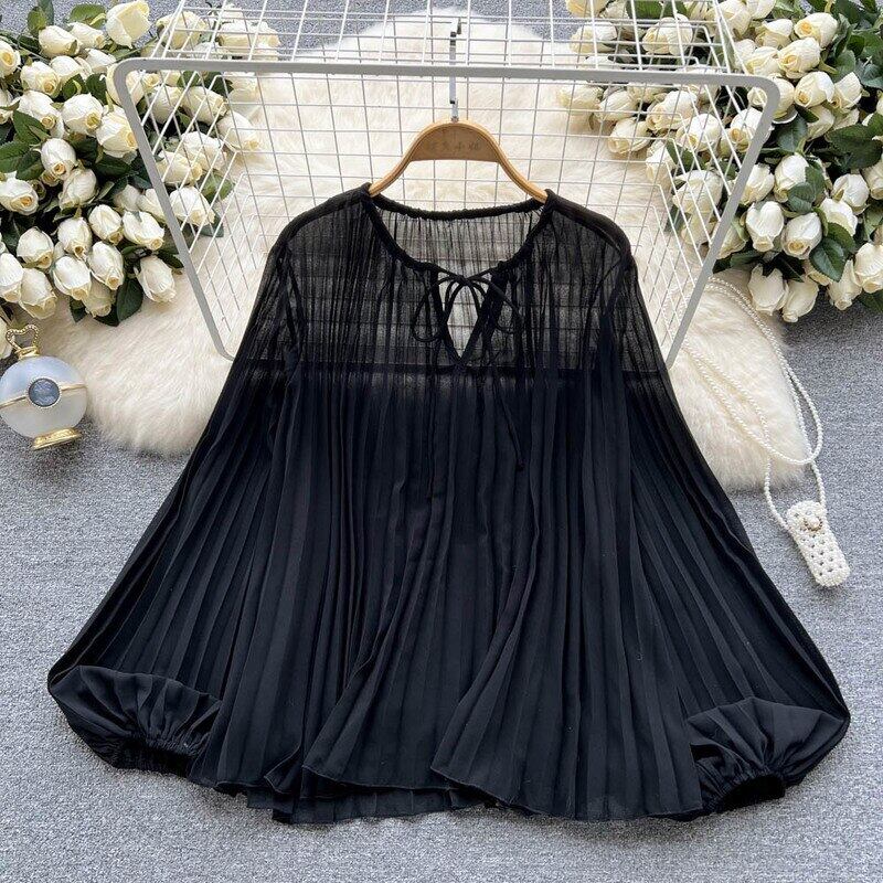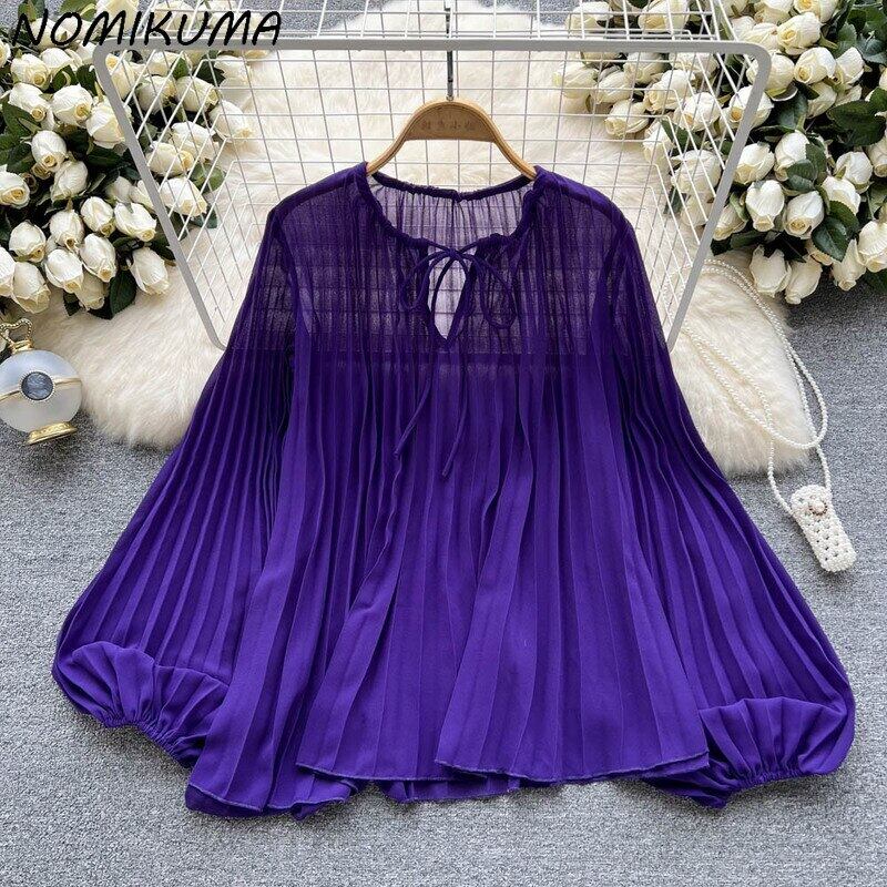 Nomikuma 因果シックなランタンスリーブブラウス女性レースアップ中空アウト O ネックシャツ 2022 秋無地 オータム 秋物 Oネック ソリッドカラー kor27311929572