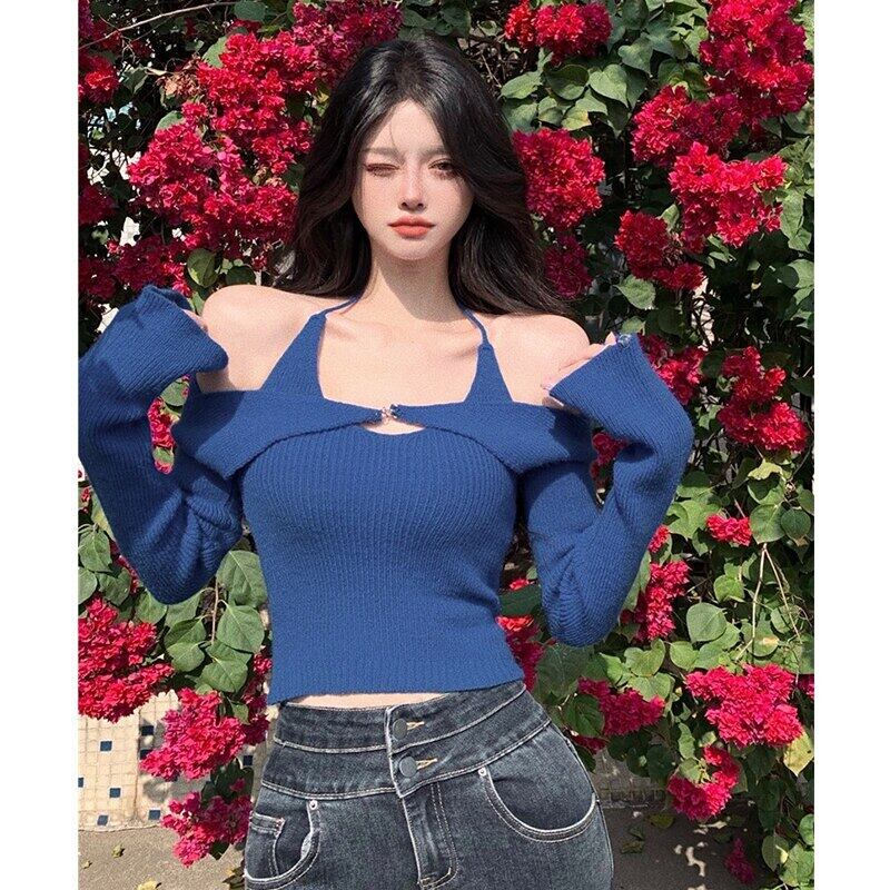 Nomikuma セクシー スリム ホルター ニット スリング ベスト + 長袖 プルオーバー クロップ ニット レディース 2点セット 2022 春 ロング スプリング 春物 kor24422885048