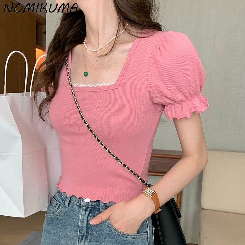 Nomikuma シックな夏パフスリーブ女性セーター甘いレースパッチワークスクエアカラーニット 2022 スリムニットトップス 大人ガーリー スウィート キュート カジュアル サマー 夏物 スクウェア kor99166469209