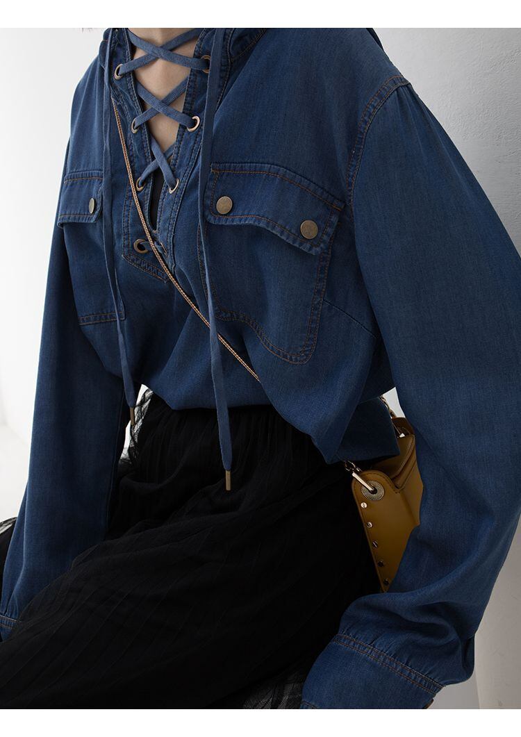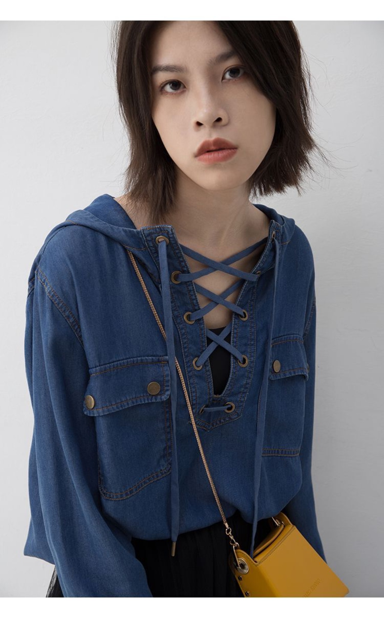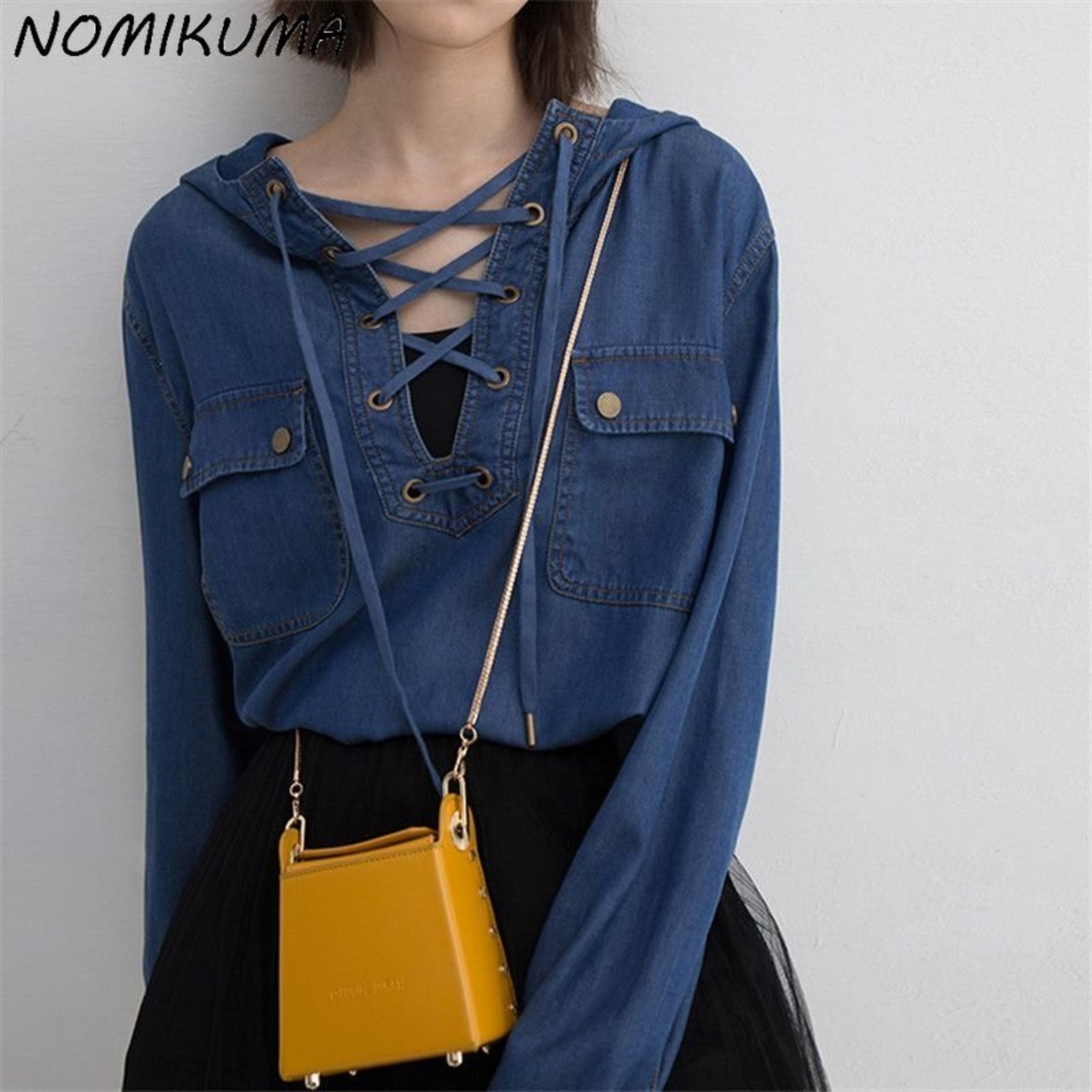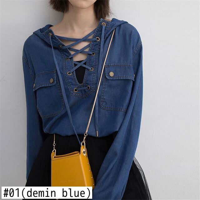 Nomikuma 2022 秋フード付き Demin ブラウスクロス包帯無地プルオーバートップス因果長袖ジーンズシャツ ロング オータム 秋物 ソリッドカラー kor66542957339