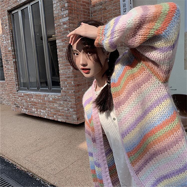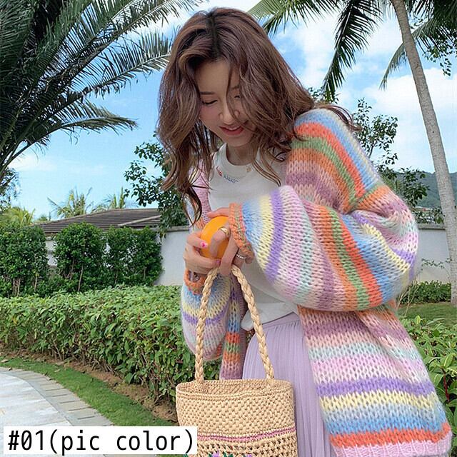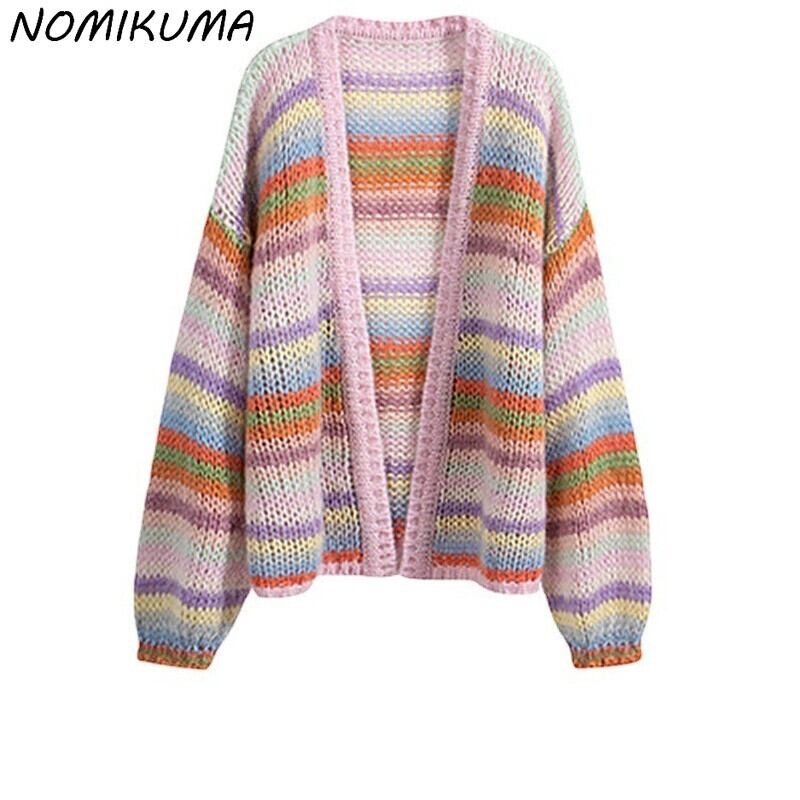 Nomikuma Ranbow ストライプ モヘア ニット カーディガン 因果長袖 V ネック セーター女性秋冬ニット オープン ステッチ ロング オータム 秋物 ウィンター 冬物 Vネック kor93920734339