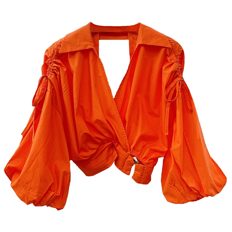 Nomikuma 2022秋デVネック巾着パフスリーブブラウストップスセクシーバックレスショートシャツ オータム 秋物 kor47972074215