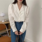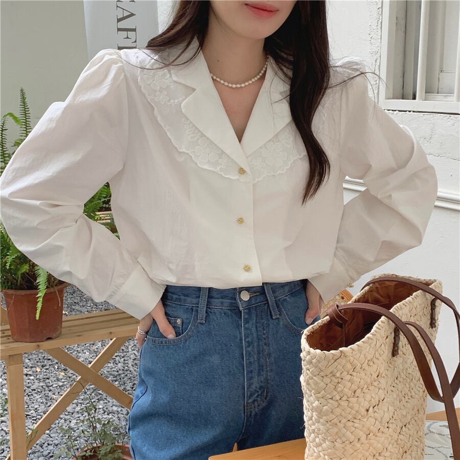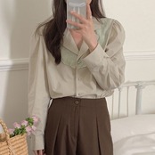 Nomikuma レース パッチワーク ノッチドカラー ブラウス トップス パフ 長袖 レディース トップス 秋 デ モダ 2022 ロング オータム 秋物 kor4070236643