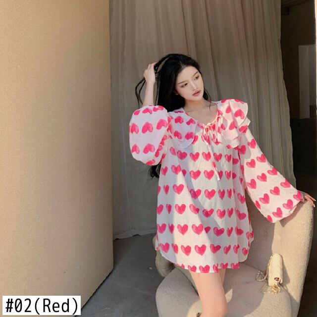 Nomikuma Love Heart プリント シフォン ブラウス シャツ 因果ランタン スリーブ ピーターパン カラー レディース トップ 6F182 ランタンスリーブ kor11420351366