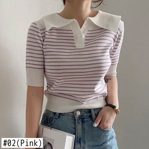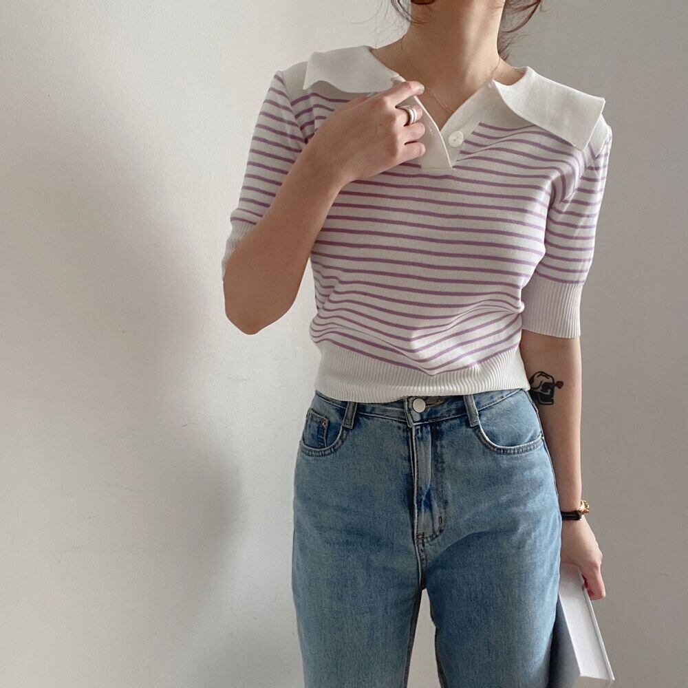 Nomikuma ヒットカラーストライププルオーバーニット因果半袖ターンダウン襟セーター女性 2022 夏ニットトップス ショート ハーフスリーブ サマー 夏物 kor94974169592
