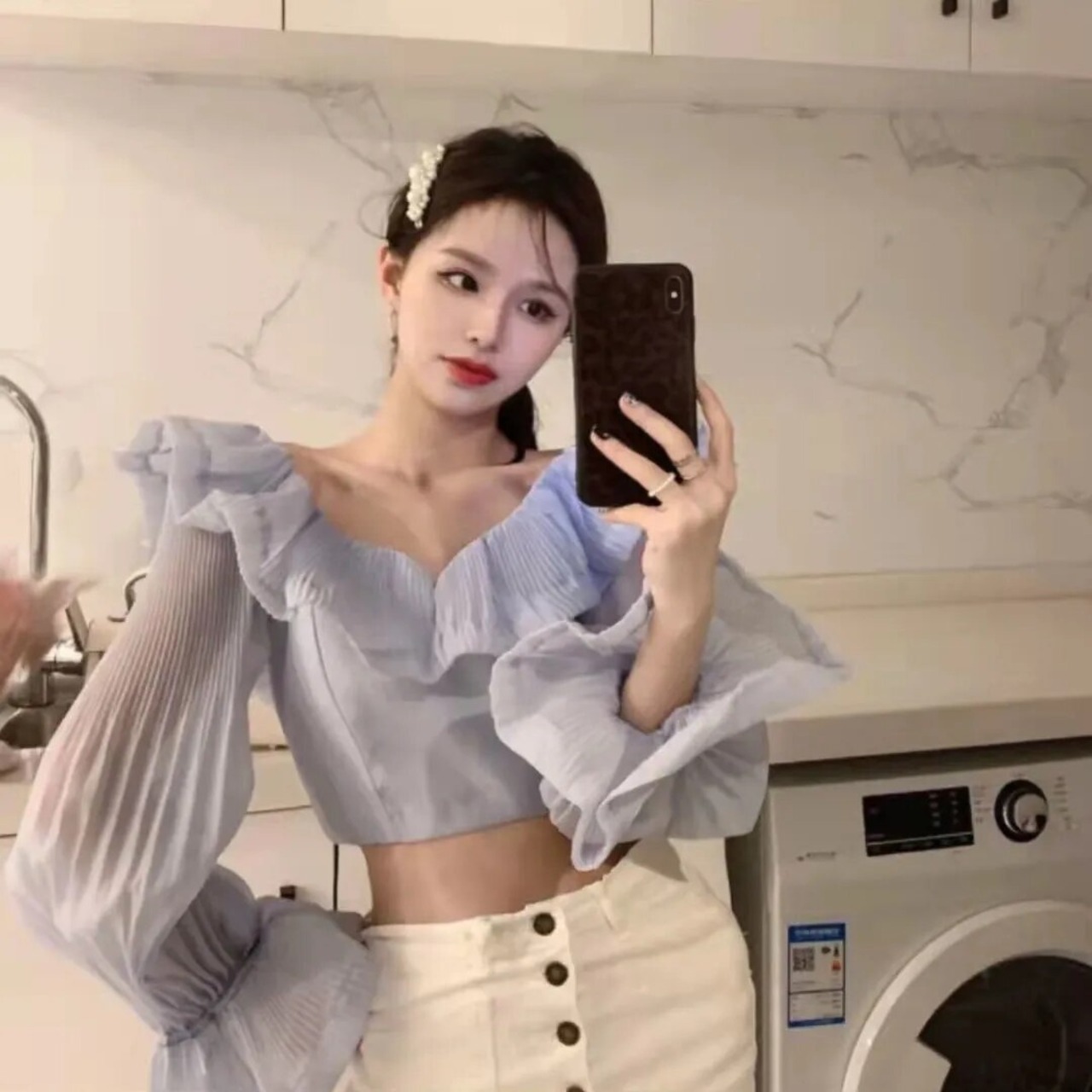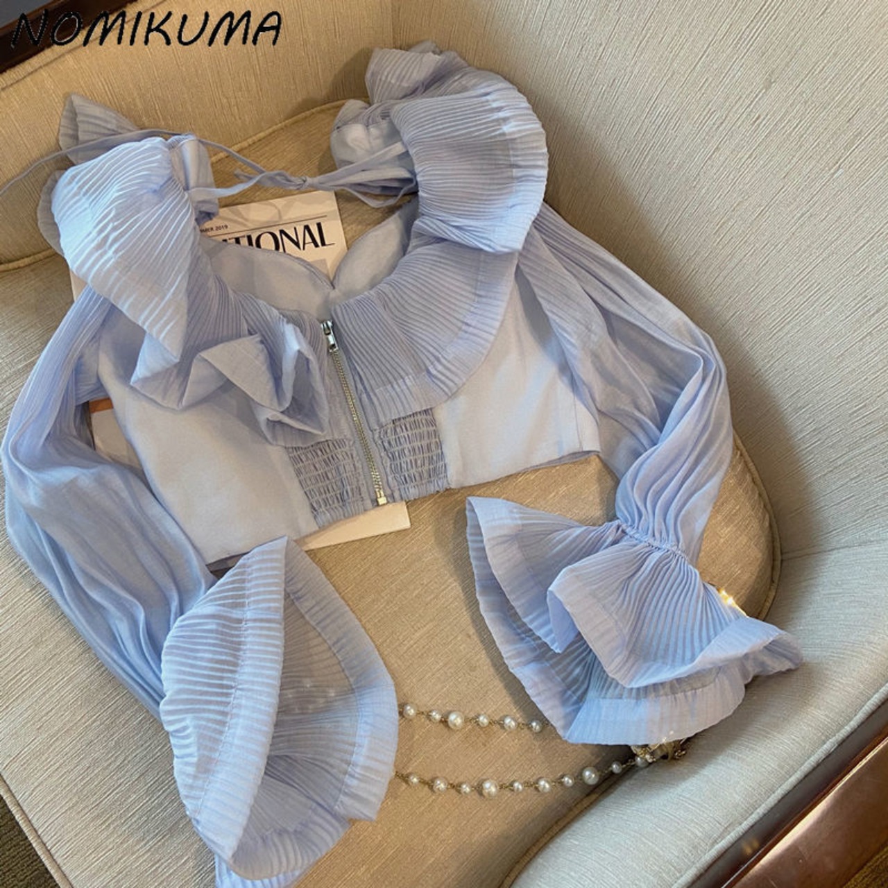 Nomikuma セクシー フリル オフショルダー ブラウス トップス 2022年 春 フレア スリーブ ショート シャツ レディース スリム デ フレアスリーブ スプリング 春物 kor22530767305