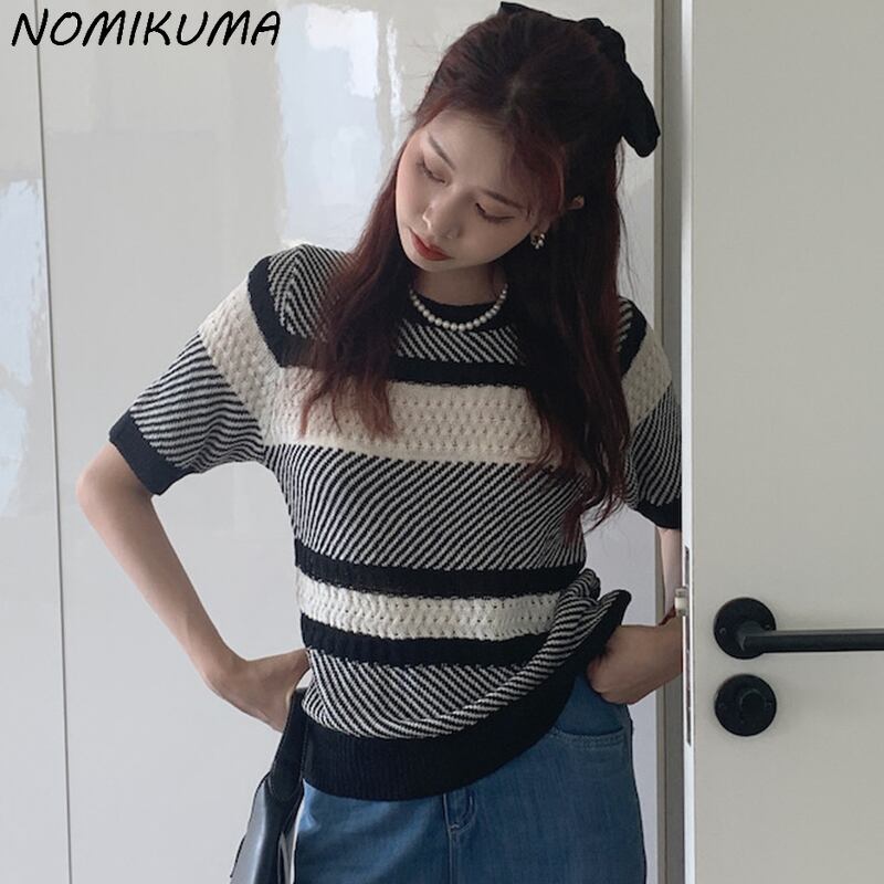 Nomikuma 女性のヒットカラーストライプセーター因果中空アウトニットプルオーバー女性 2022 夏半袖ニットトップス ショート ハーフスリーブ サマー 夏物 kor1079221964