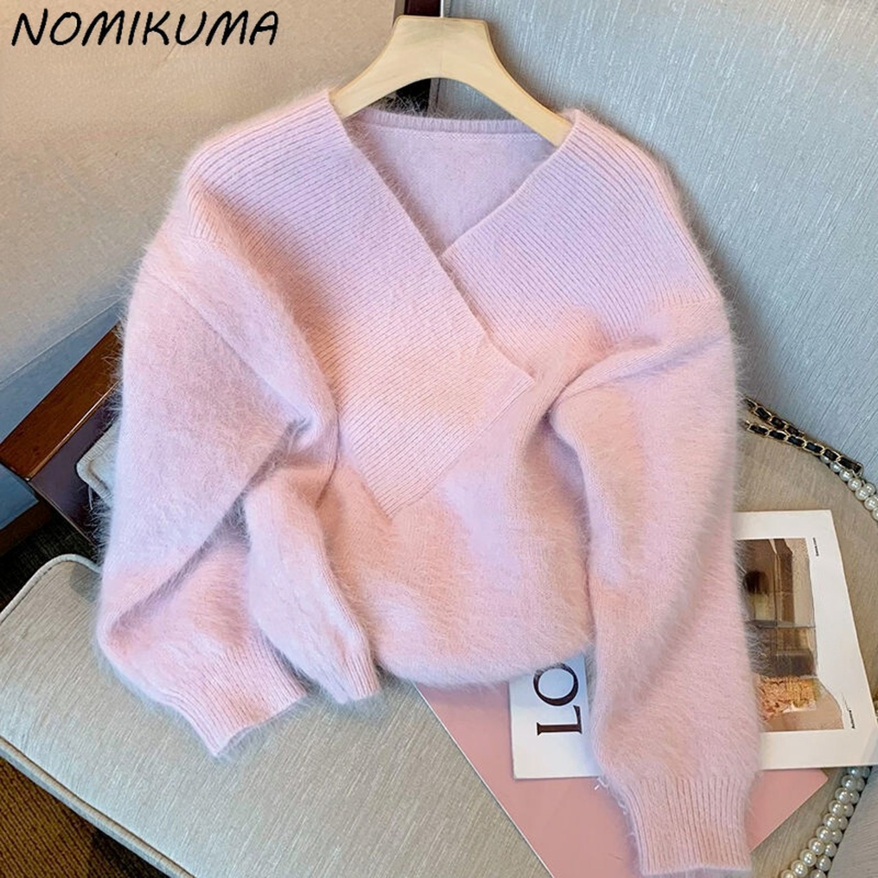 Nomikuma ピンク V ネックセーター女性 2021 秋冬プル長袖スウィートプルオーバーニットトップス 6Q133 ロング 大人ガーリー キュート カジュアル オータム 秋物 ウィンター 冬物 Vネック kor98333959915