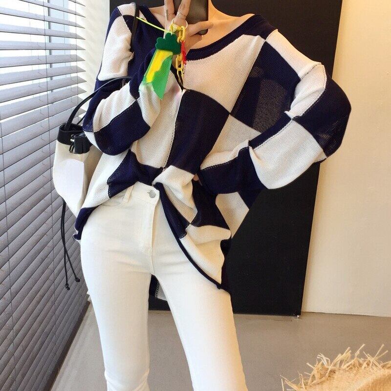 Nomikuma V ネックコントラストカラーチェック柄プルオーバーニット 2021 秋長袖女性ニットトップス因果セーター 6L315 ロング オータム 秋物 Vネック kor21232715740