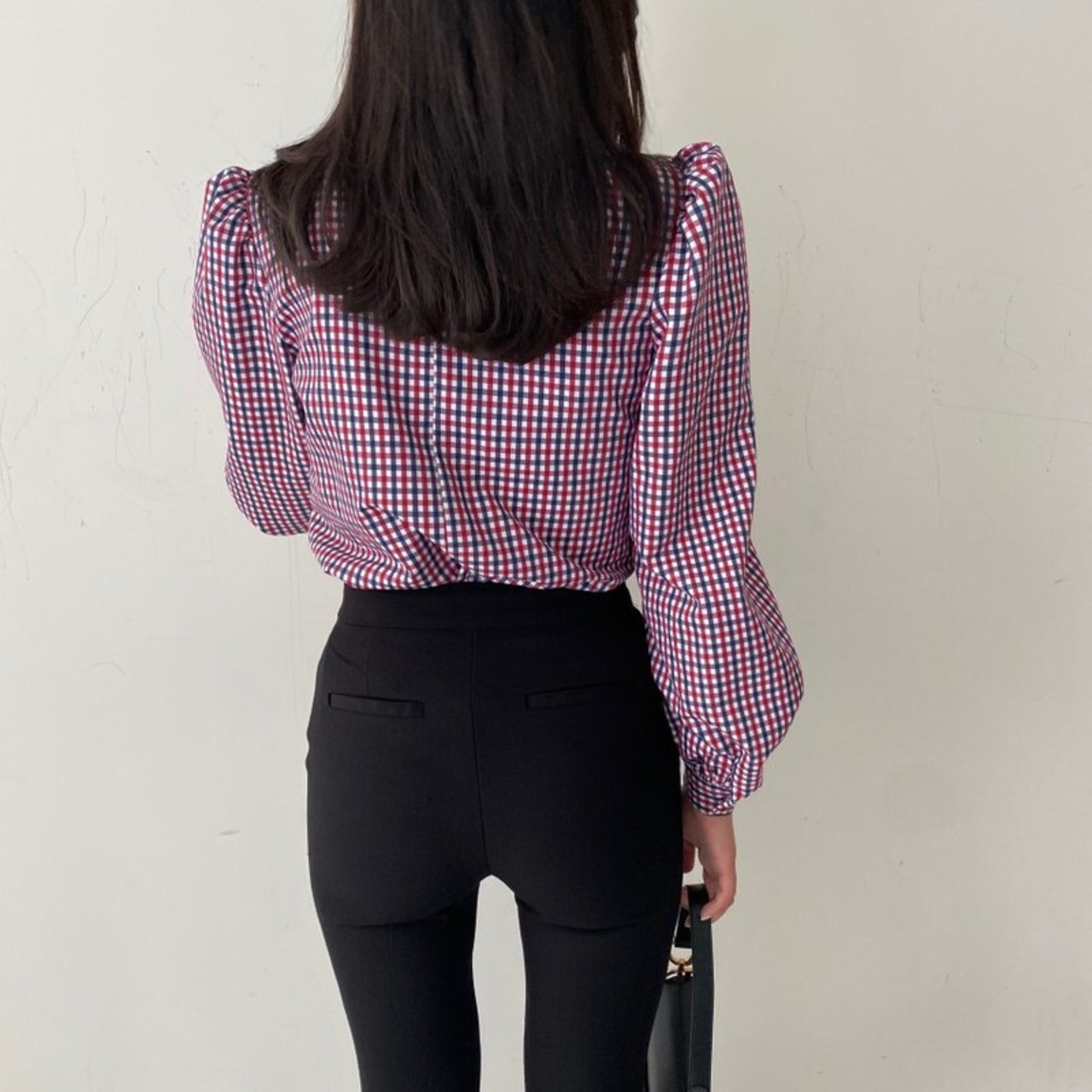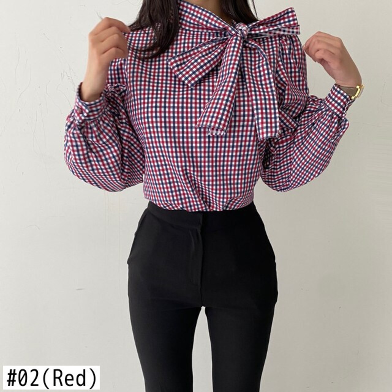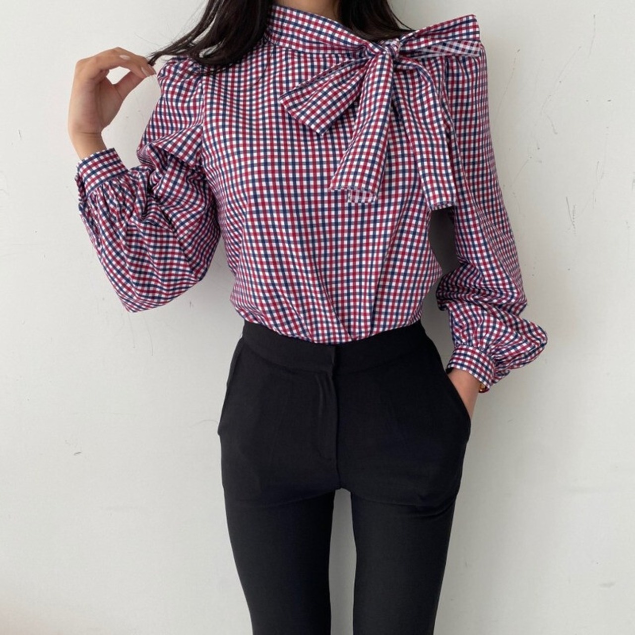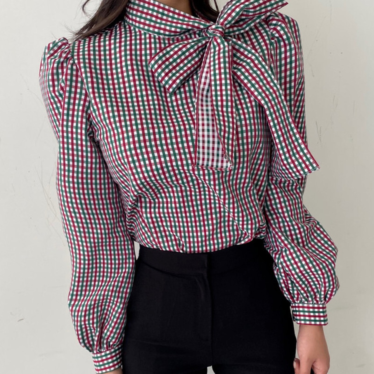 ノミクマチェック柄ブラウス秋蝶ネクタイスタンドネックレディーストップス 2021 パフスリーブ Blusa シャツ 6L674 リボン オータム 秋物 kor53191022237