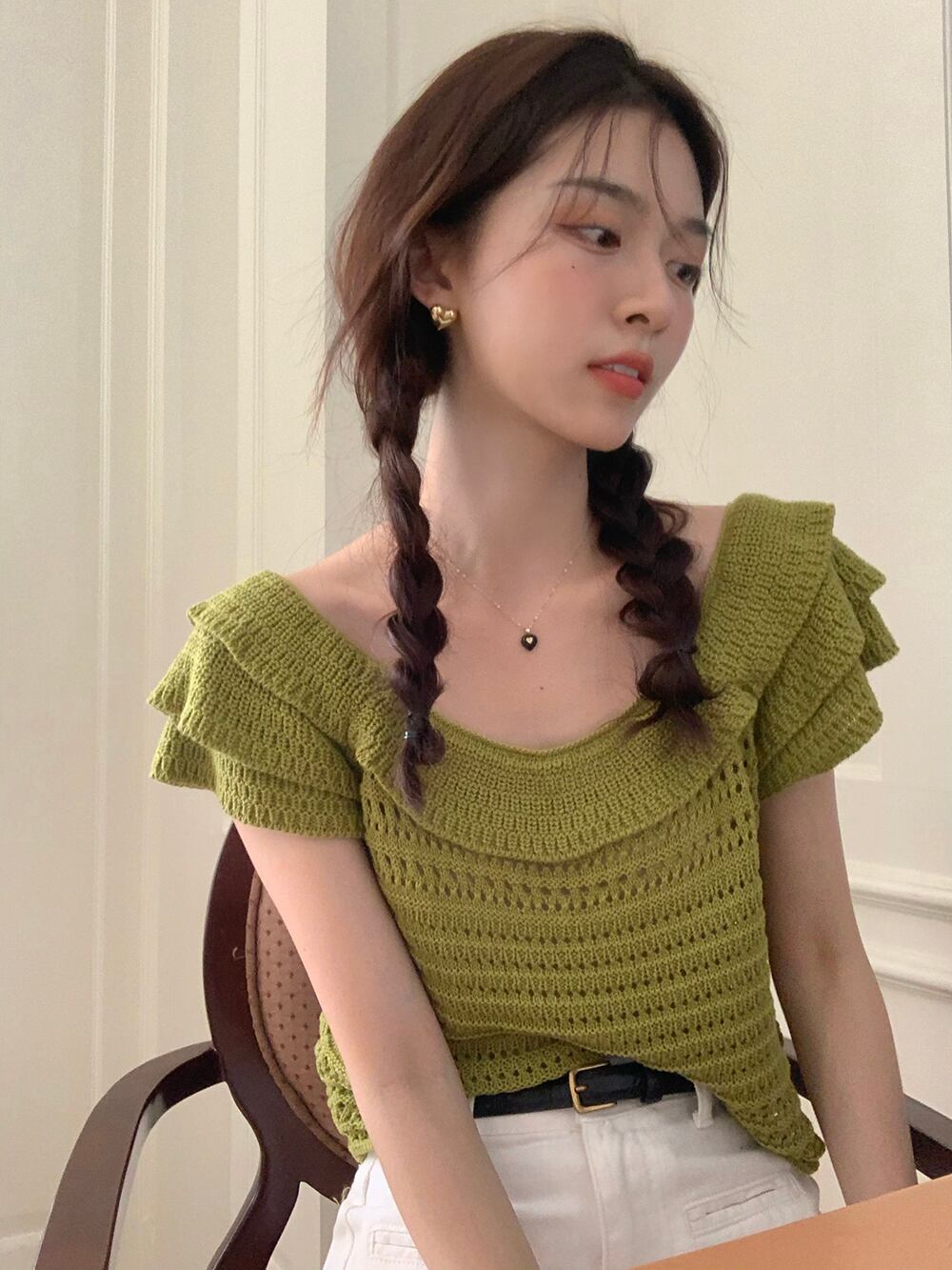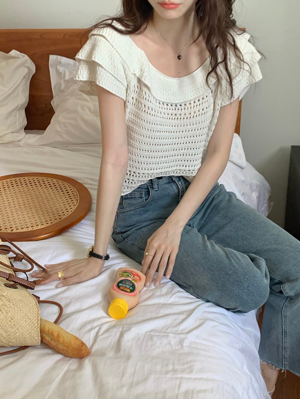 ノミクマ 夏 くり抜きジャカードニット フリルパッチワーク 半袖 スクエアカラー プルオーバー ニットセーター ショート ハーフスリーブ サマー 夏物 スクウェア kor32653468161