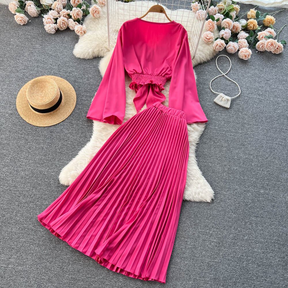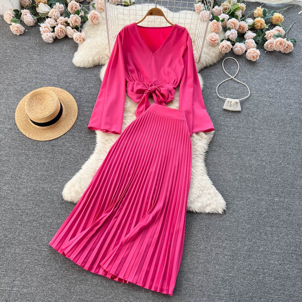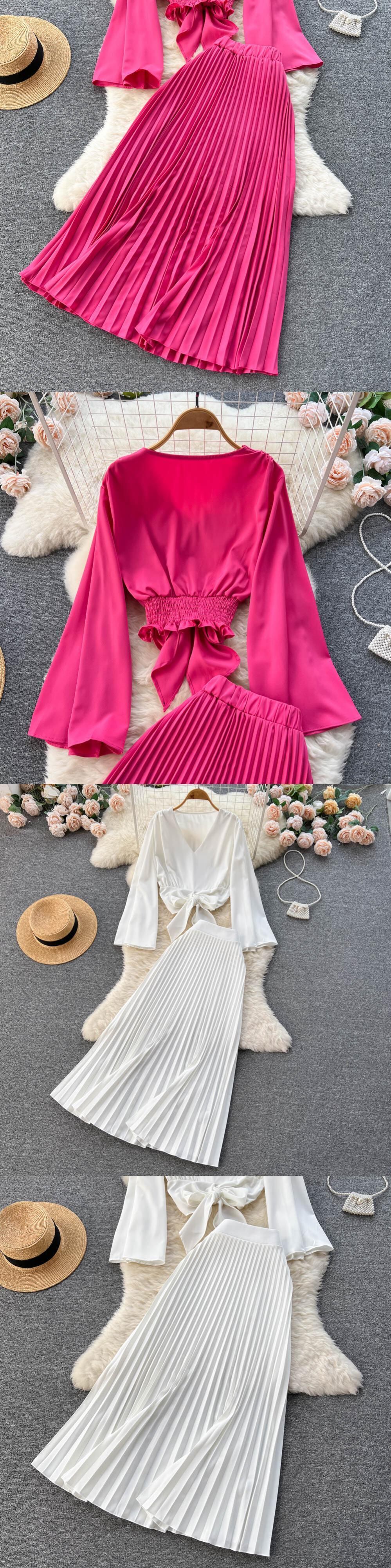 Nomikuma 秋 2022 女性セット長袖 V ネック弓包帯ブラウストップス + ウエスト因果 A ラインスカート 2 ピース ロング リボン オータム 秋物 Vネック Aライン kor95191834829