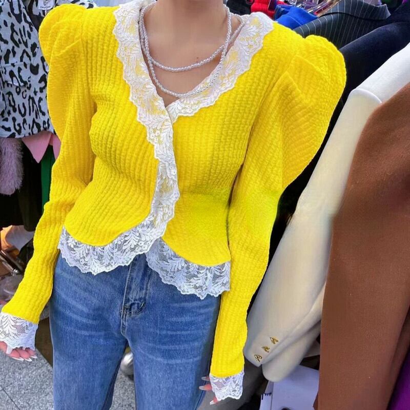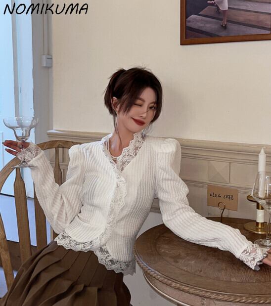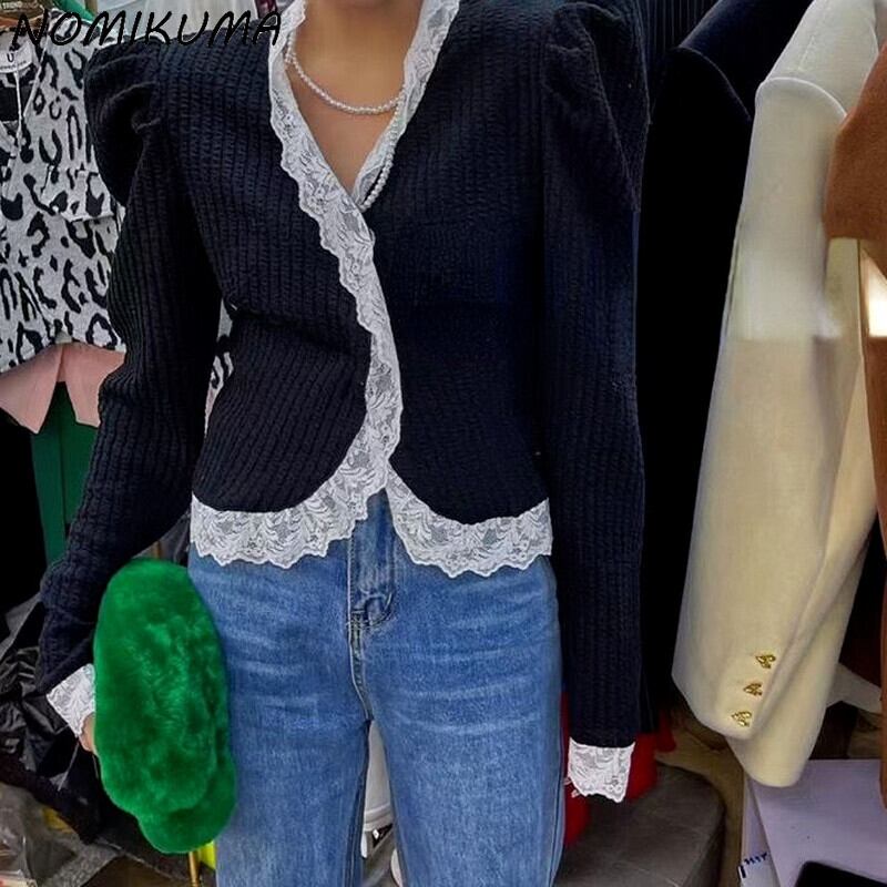 ノミクマレースパッチワークニットカーディガン風パフスリーブVネックセーターコート2022春ニットトップス スプリング 春物 kor79514727122