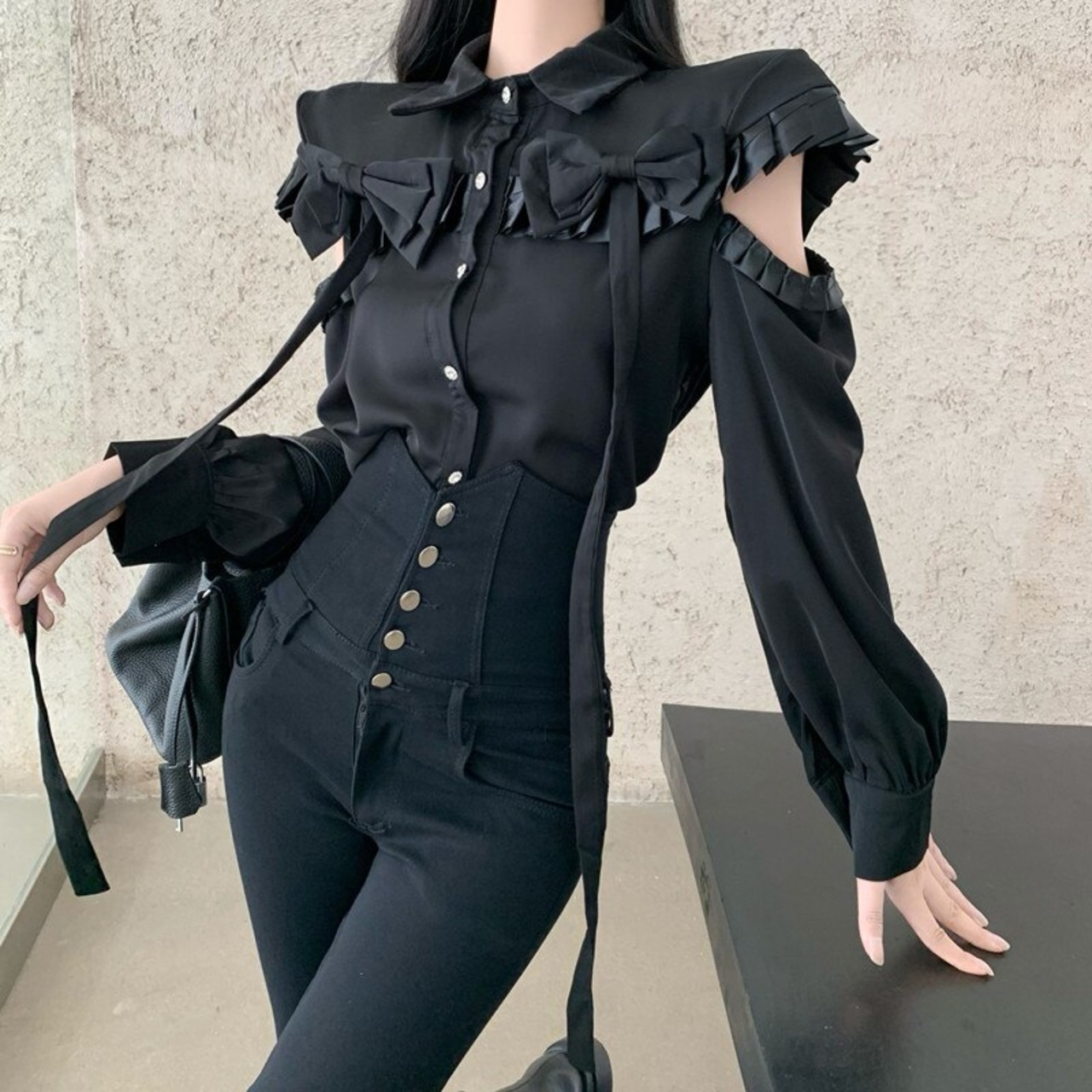 Nomikuma シックな中空アウト フリル長袖ブラウス甘いちょう結び女性シャツ 2022 年春ターンダウン襟 ロング リボン 大人ガーリー スウィート キュート カジュアル スプリング 春物 kor19119686823