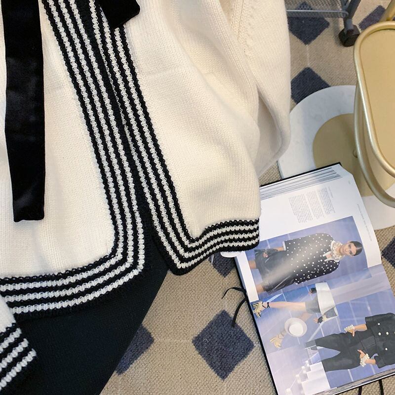 ノミクマ シックなちょう結びセーターコート ヒットカラー ストライプ ターンダウンカラー カーディガン 2022秋 長袖 ニット 開編み ロング リボン オータム 秋物 ステッチ kor85951488376