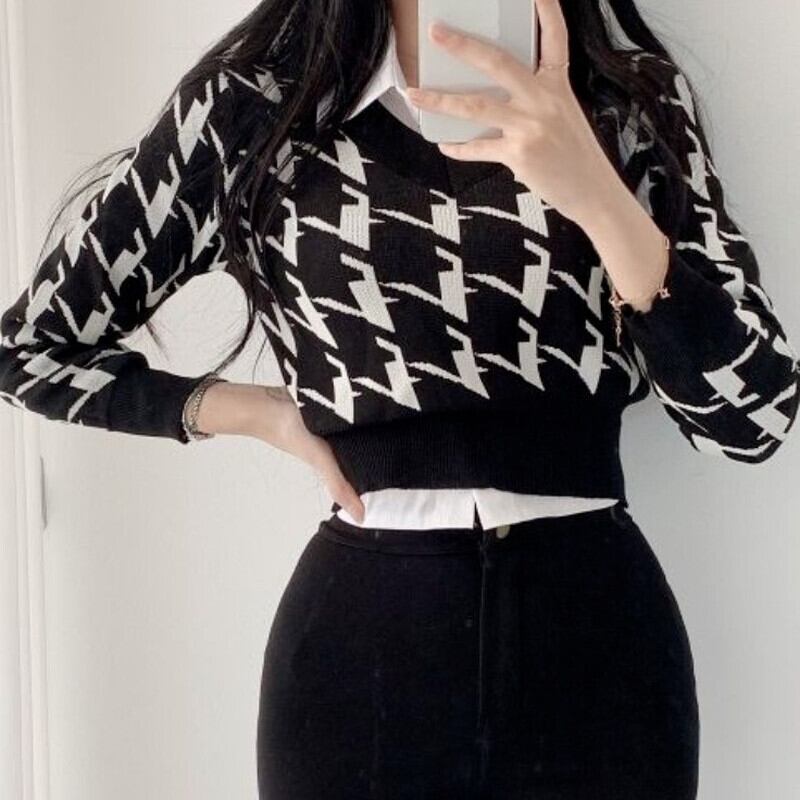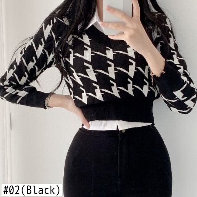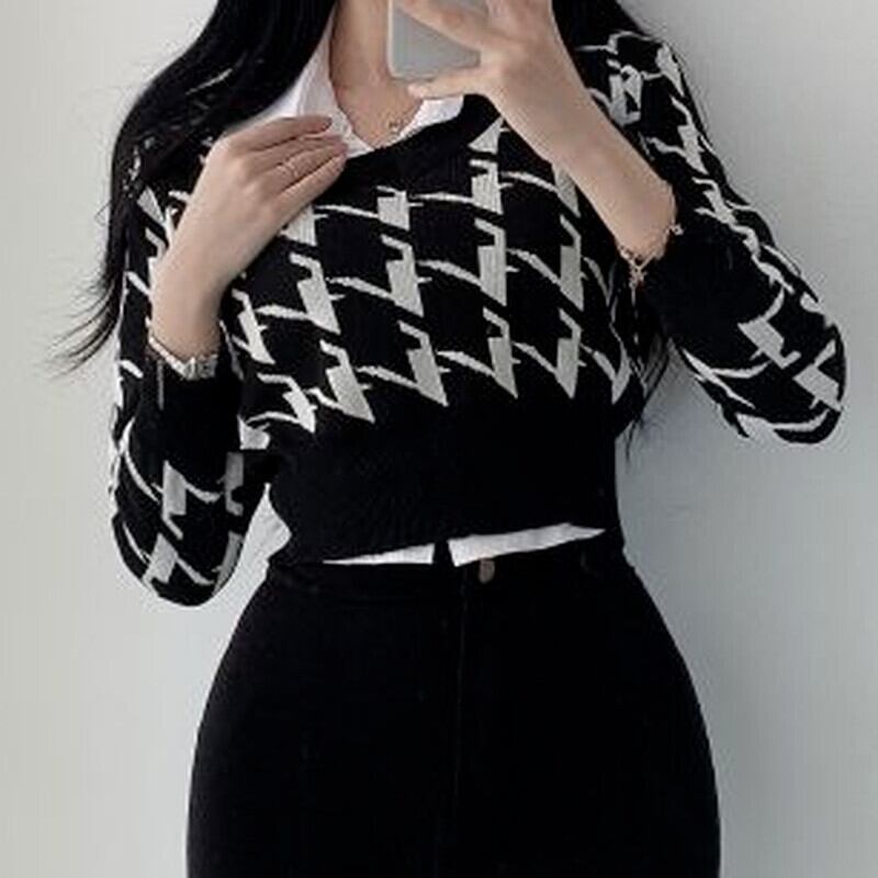Nomikuma チェック ジャカード ショート ニット セーター スリム ロング スリーブ V ネック ニット セクシー クロップ ジャンパー 6X978 長袖 Vネック kor49623979934