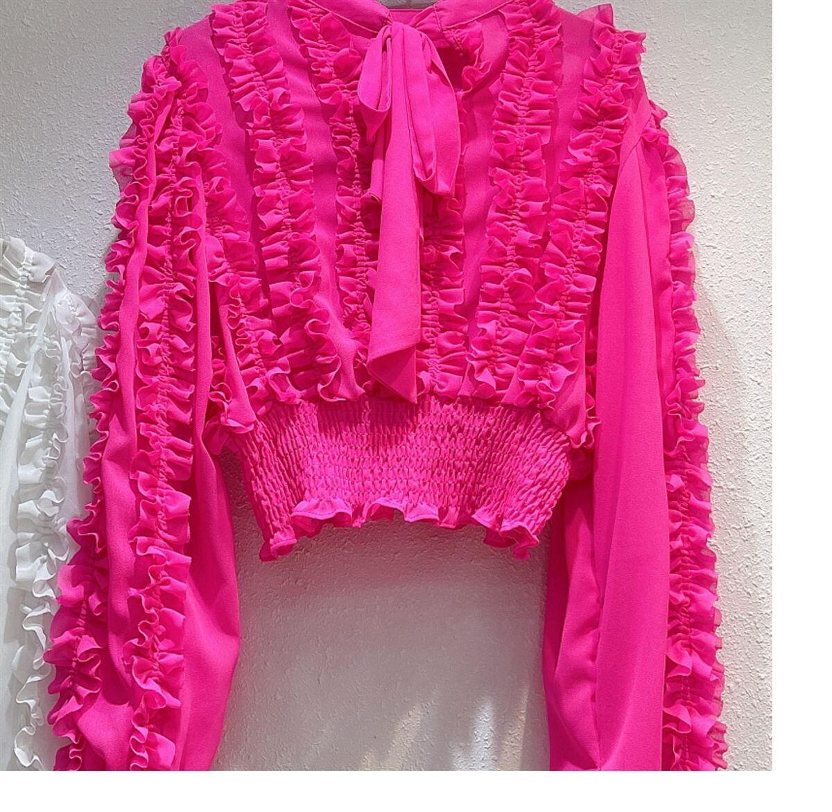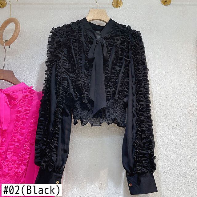 ノミクマ シフォンブラウス 2022年秋 リボン バンデージ Oネック ショート プルオーバー トップス シックなフリル パッチワーク シャツ kor68826763003