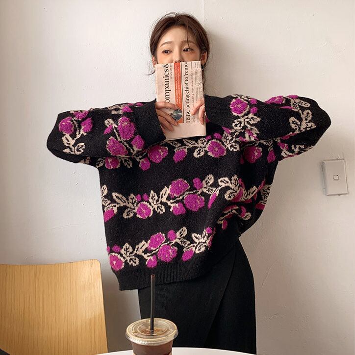 ノミクマ 2020 秋冬 プル ヒットカラー ローズジャカードセーター カジュアル 長袖 Oネック ニット プルオーバー 6C452 ロング オータム 秋物 ウィンター 冬物 kor25713801119