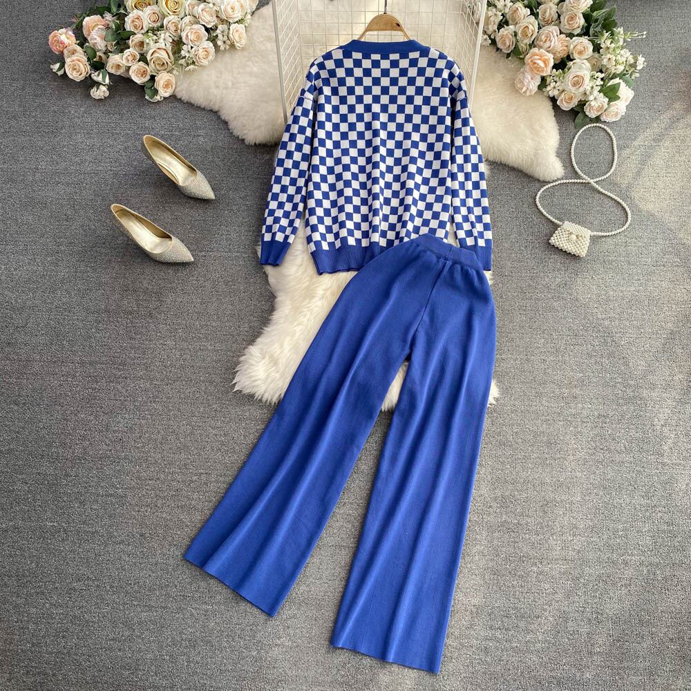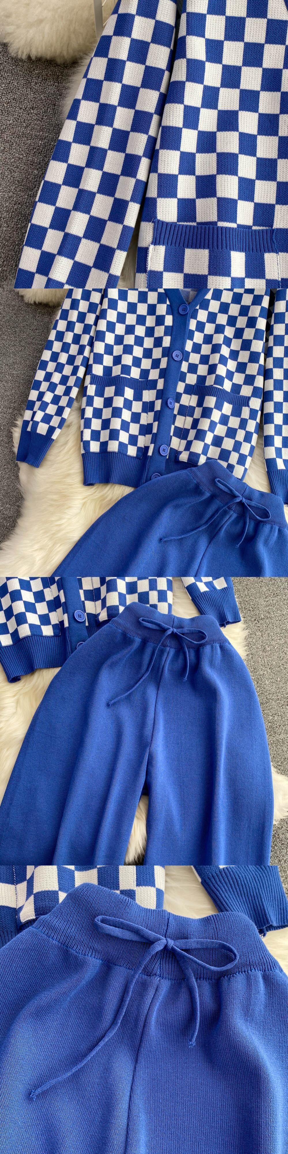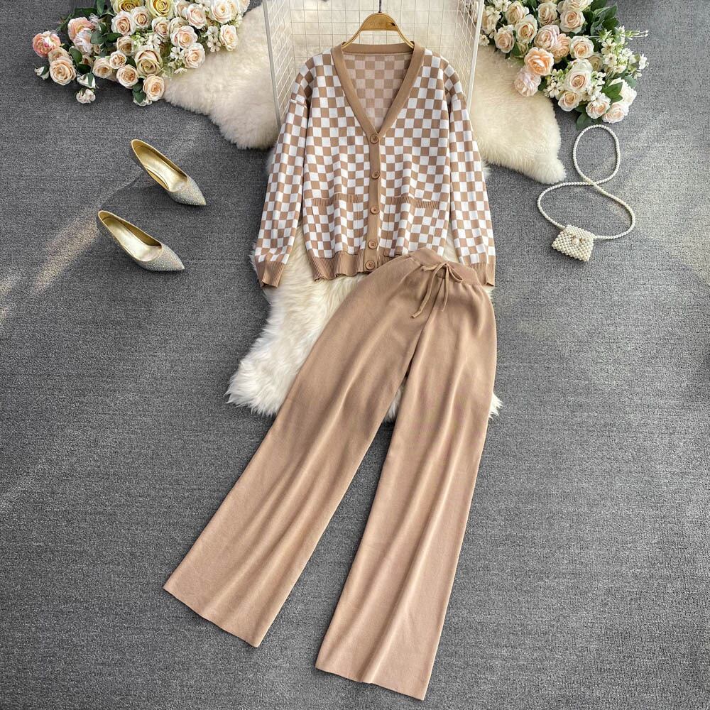 ノミクマセット カジュアルVネック長袖ニットカーディガン+レースアップウエストワイドレッグロングセーターパンツ ニットスーツ ワイドパンツ kor29390501509