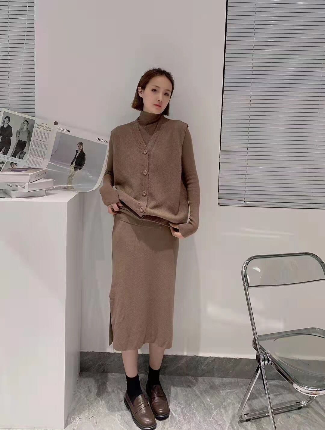 ノミクマ スリーピース セーター セット ノースリーブ ニット カーディガン ベスト + タートルネック ロング ルシーブ ニット + ウエスト分割スカート kor43544520023