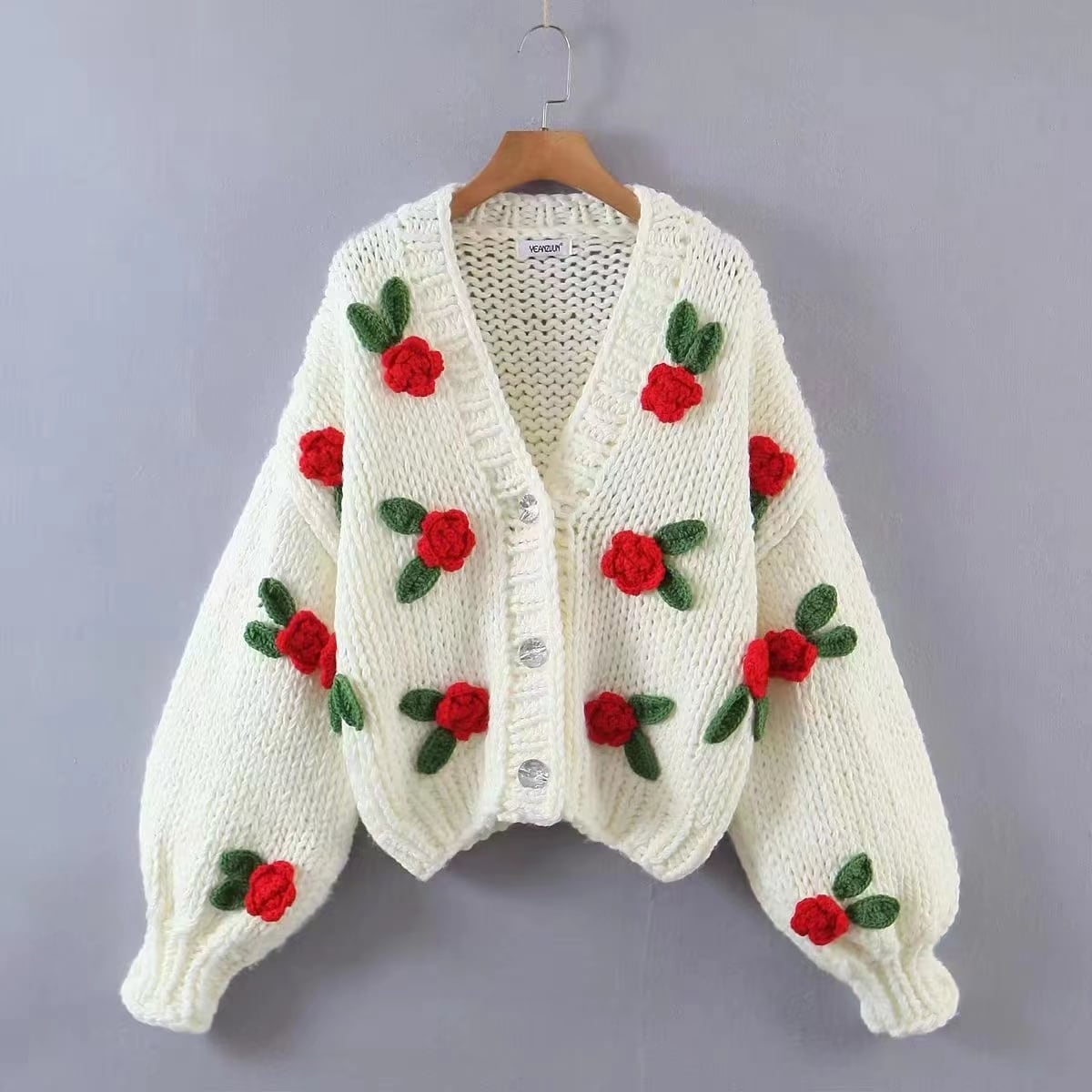 ノミクマ 2022秋冬 ハンドフラワー カーディガン セーター Vネック 長袖 ショート カジュアル ニット コート ロング オータム 秋物 ウィンター 冬物 フラワーデザイン kor8645243826