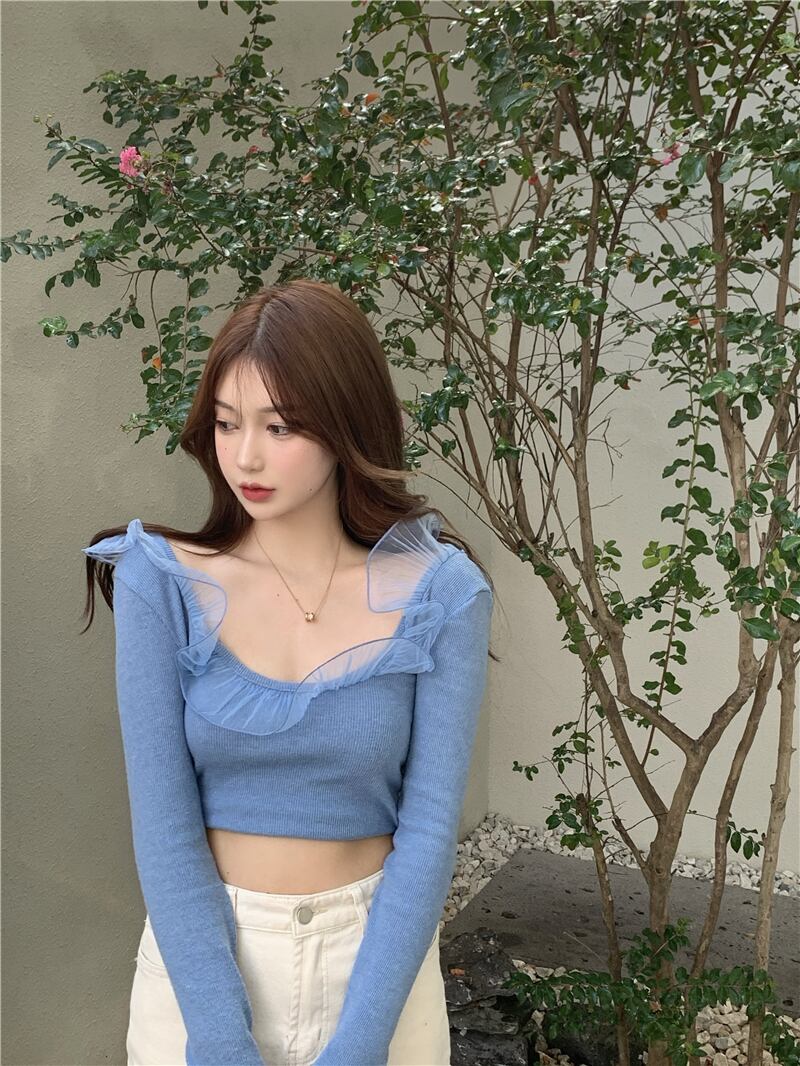ノミクマ 秋冬 スリム ベーシック ニット メッシュ フリル パッチワーク ニット トップス 無地 ウエスト ショート クロップ セーター 6C983 オータム 秋物 ウィンター 冬物 ソリッドカラー kor77583139502