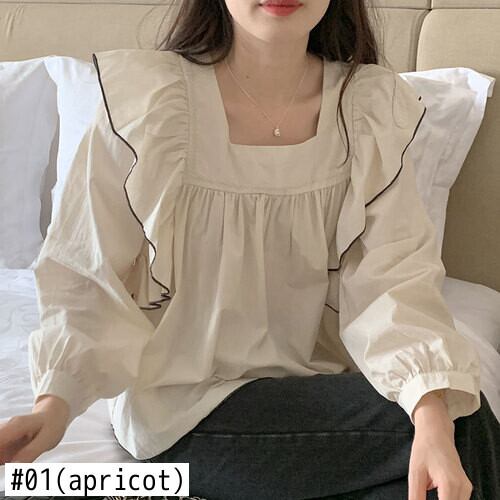 ノミクマ シック 秋 スクエアカラー パッチワーク フリル ブラウス 2022年 パフスリーブ プルオーバー トップス カジュアル オータム 秋物 スクウェア kor7400904686