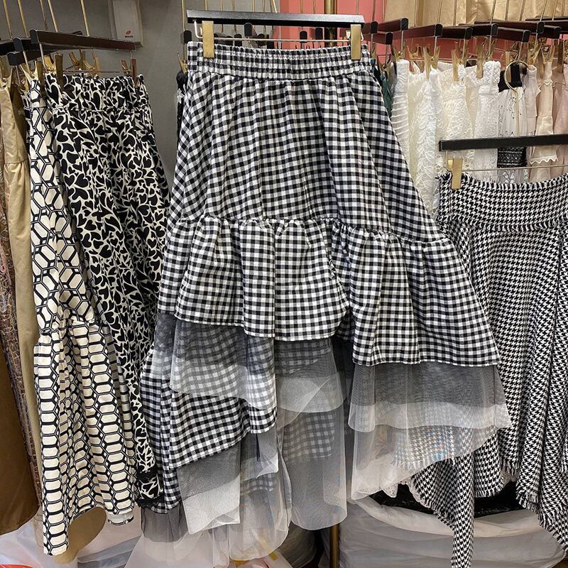 ノミクマ因果ストレッチウエストチェック柄スカートレースフリルパッチワーク不規則な女性のスカート 2021 春ミディスカート 6E631 スプリング 春物 kor92560300884