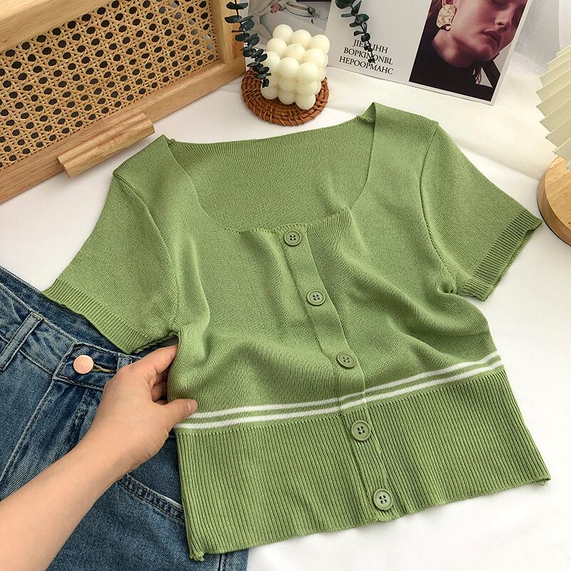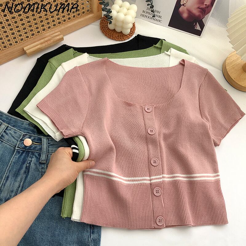 Nomikuma スクエアカラー シングルブレスト 半袖 ニットウェア レディース 2022 スリム クロップド ニット トップス セーター ショート ハーフスリーブ スクウェア kor49434667685