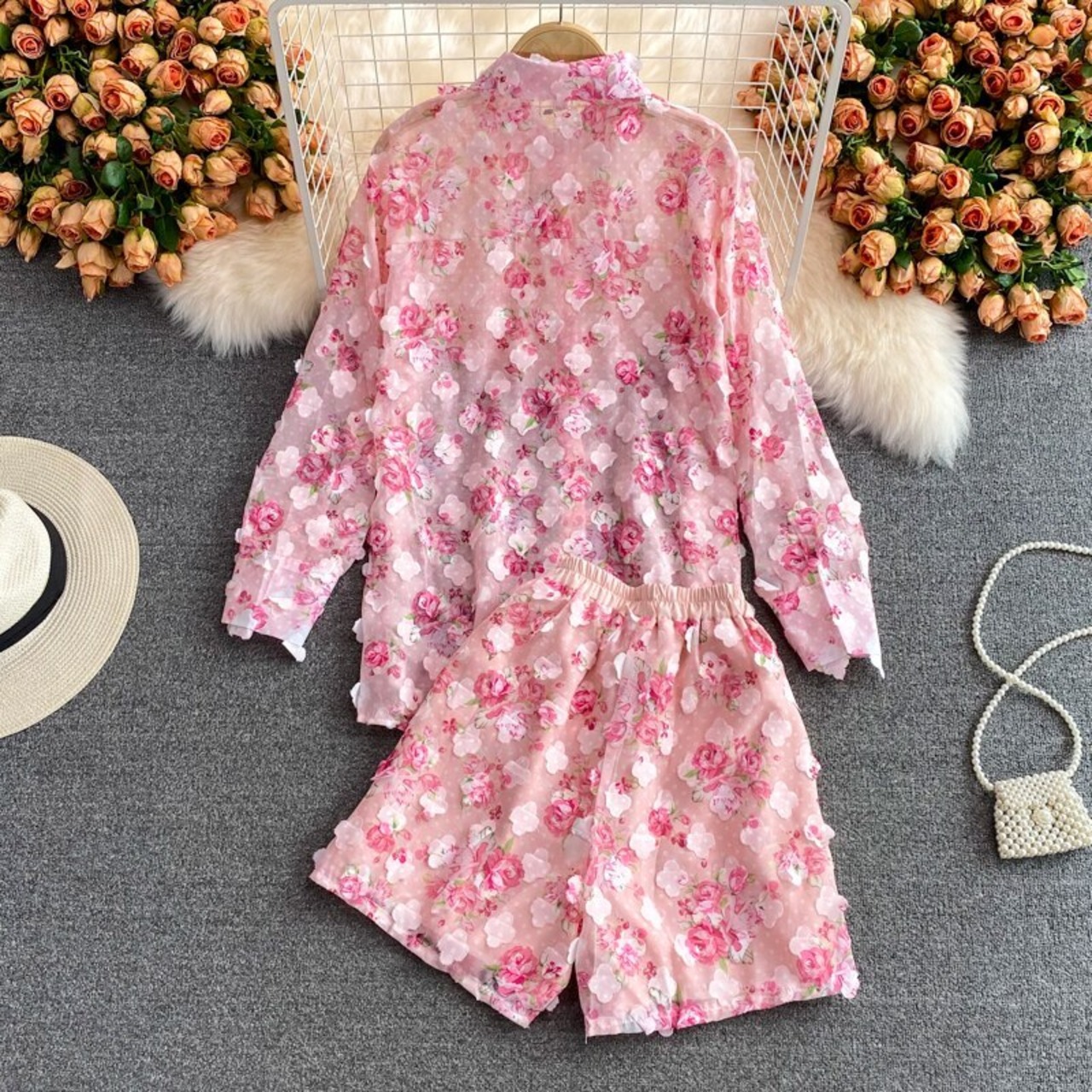 Nomikuma 3D 花柄 2 点セット 因果長袖ブラウス シャツ + ウエスト ワイドレッグ ショーツ 2021 女性の衣装 6K956 ロング ブルマー ワイドパンツ kor37630617651