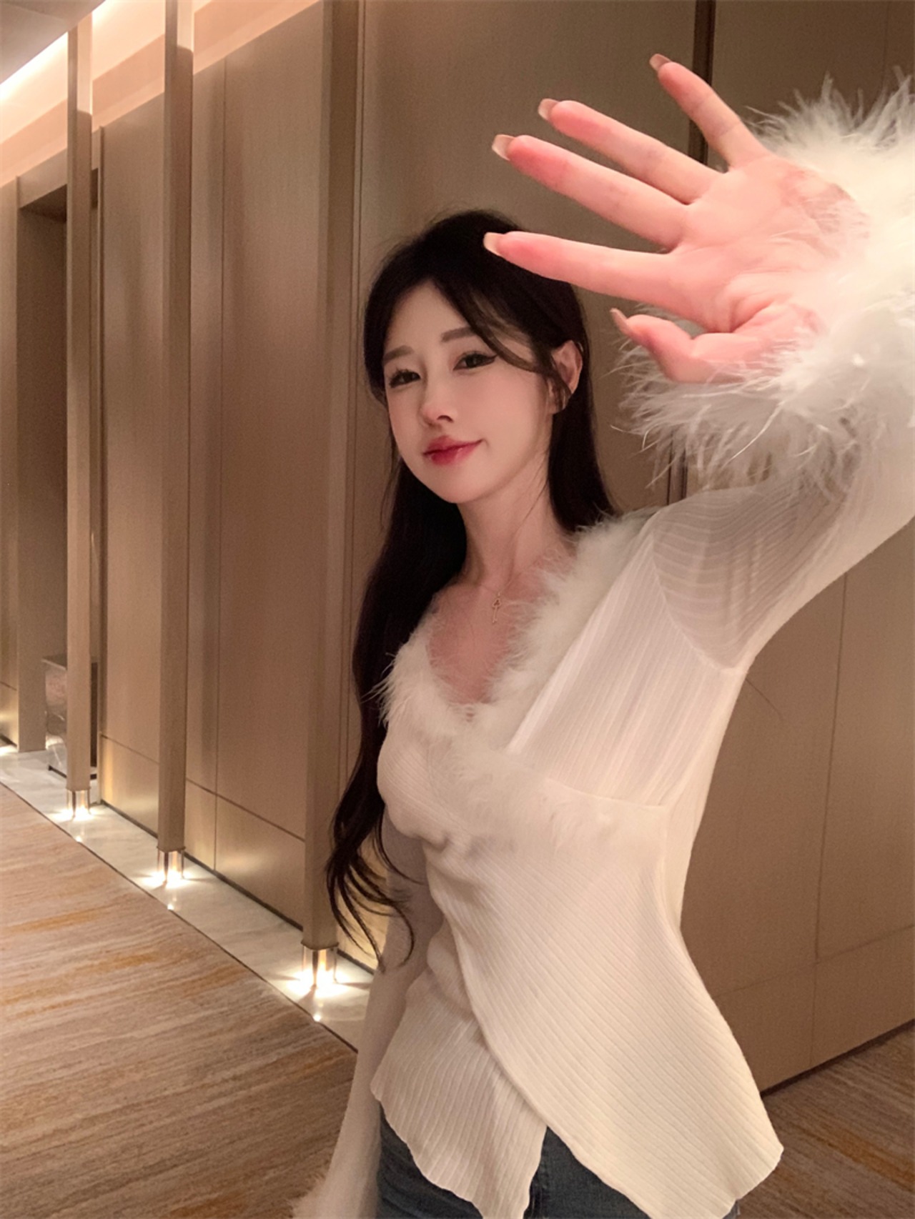 ノミクマ ファー パッチワーク Vネック イレギュラー スリム ウエスト ストレッチ ニット 2022秋冬 ニット ボトムス セーター オータム 秋物 ウィンター 冬物 kor47261200786