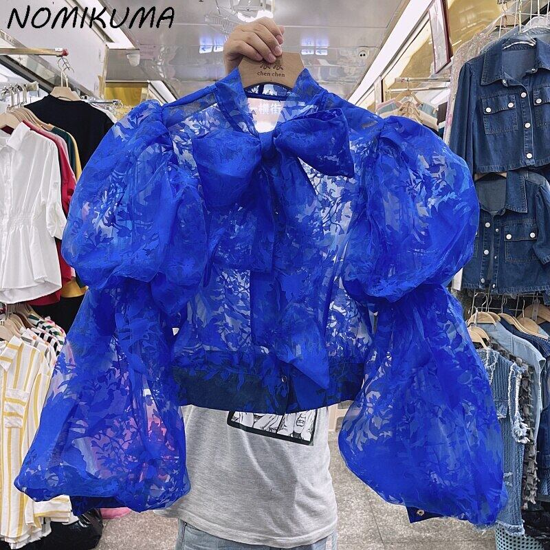 Nomikuma シックな刺繍メッシュシャツ女性 2022 秋の蝶ネクタイスタンドネックパフスリーブブラウス リボン オータム 秋物 kor90311825142