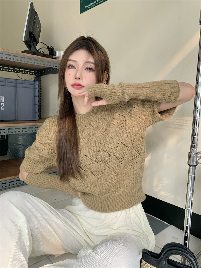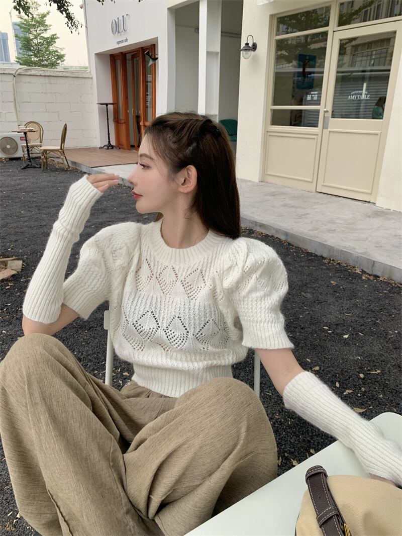 ノミクマ プルホロウアウト スリムウエスト ショートニット スウィートシック パフスリーブ Oネック ニットセーター 2022 大人ガーリー キュート カジュアル kor40063676353