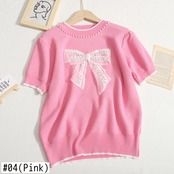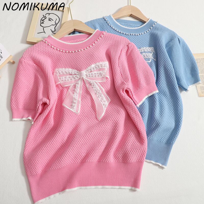 Nomikuma シックなビーズちょう結び甘いセーター女性 2022 夏薄型半袖 O ネックプルオーバー因果スタイルニットトップス ショート リボン ハーフスリーブ 大人ガーリー スウィート キュート カジュアル サマー 夏物 Oネック kor59138100335